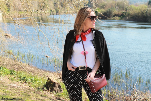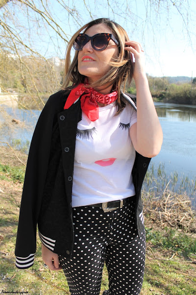 Camiseta básica blanca con estampado de ojos y labios, bandana roja al cuello y bolso a juego, bomber en color negro y sneakers para hacer el outfit cómodo.