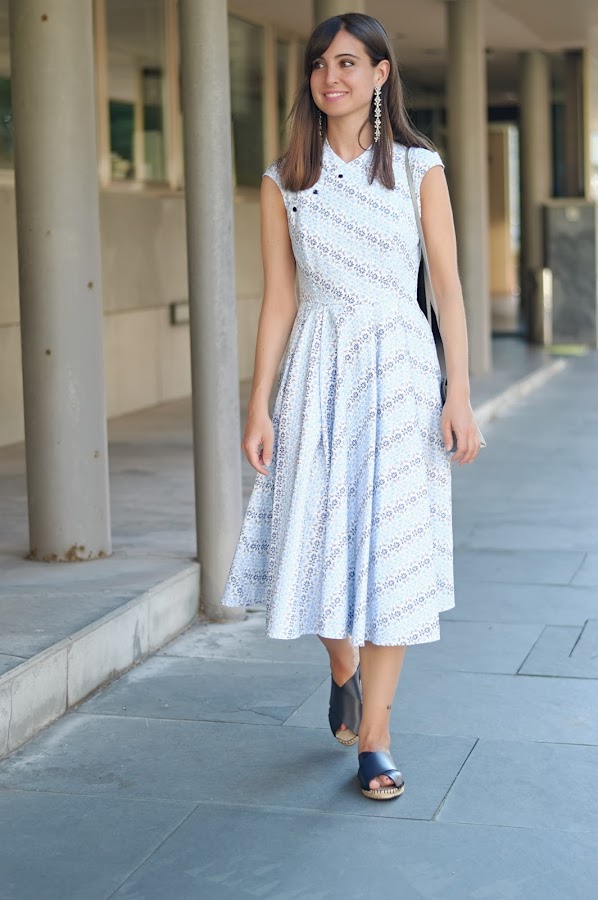 Vestido y bolso: Adolfo Domínguez / Sandalias: Uterqüe / Pendientes: Zara