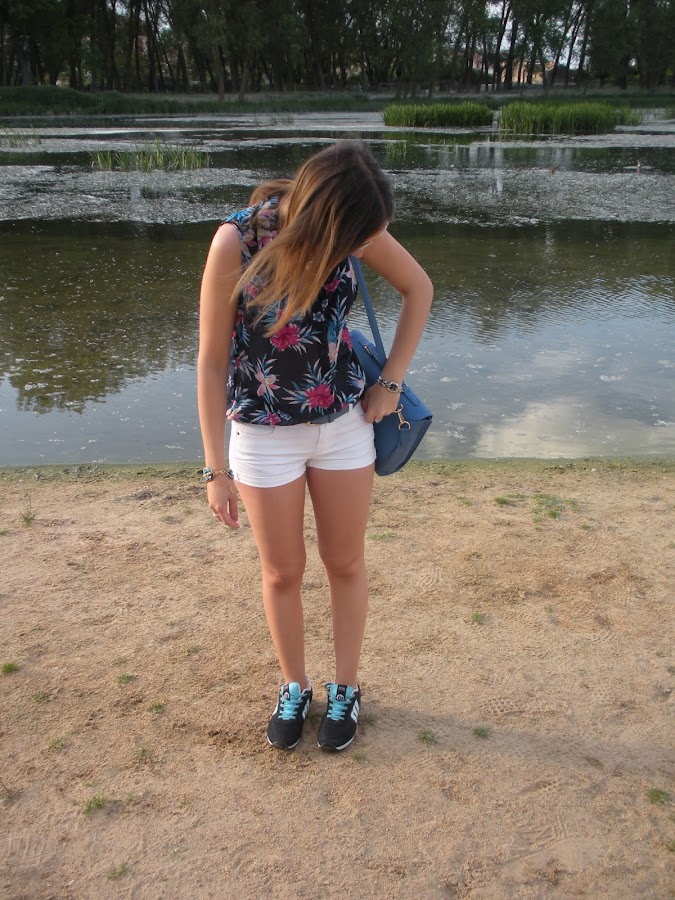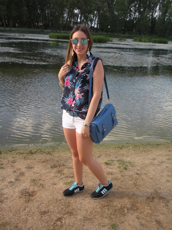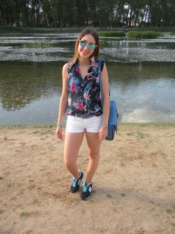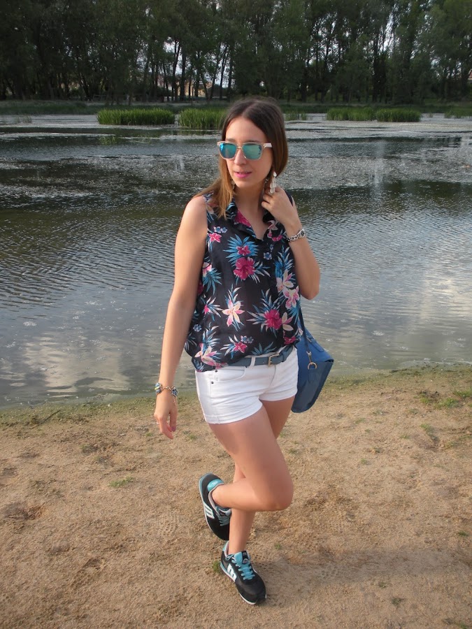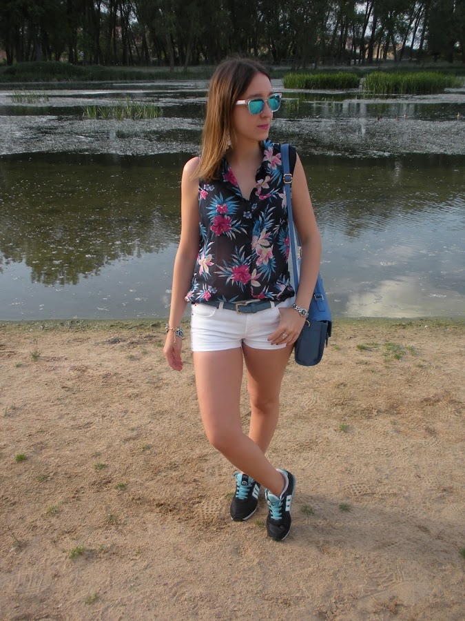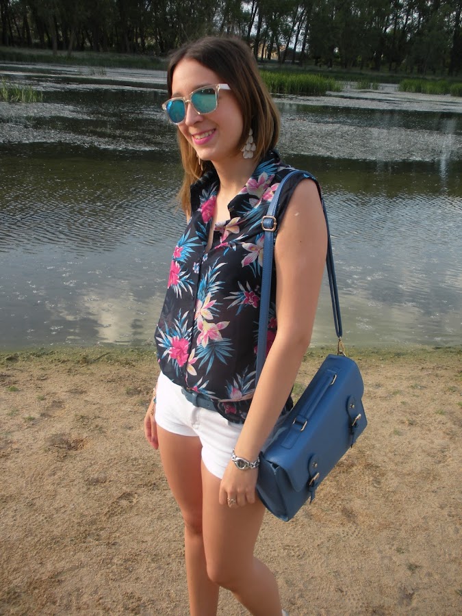 Como ha hecho tan bueno estos días he podido estrenar ropita, ¡con las ganas que tenía! Llevaba tiempo detrás de unos shorts blancos y cuando vi estos en PRIMARK por 9 ??? no me lo pensé, se vinieron directos para casa. Como ese día tocaba ir a dar un largo paseo opté por ir cómoda y sport: gafas de espejo, zapatillas, bolso bandolera y una blusa con estampado tropical, todo en la gama de los azules.