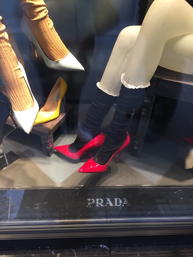 Ayer me llamó la atención PRADA. Unos stilettos rojos con calcetín negro con puntillas.