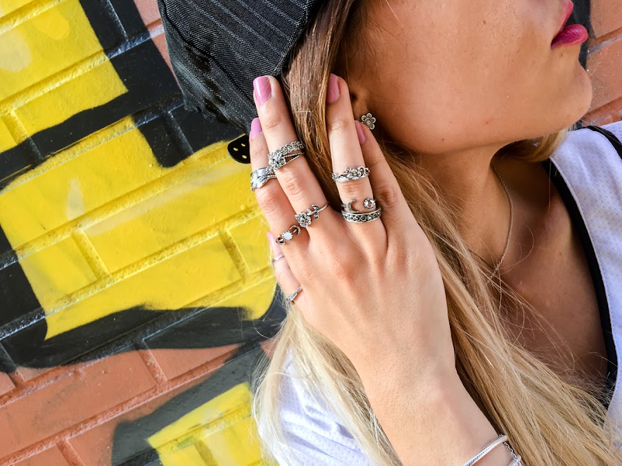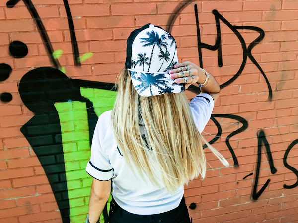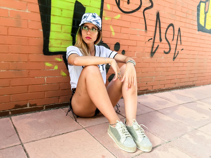 La he combinado con shorts negros rasgados, cerrado por cordones laterales que le da un toque súper sexy, que por cierto, son súper cómodos ya que son elásticos y no aprietan nada, mis zapatillas de esparto, mi gorra de estampado tropical también en blanco y negro y como complementos, llevo mi nuevo set de anillos, que son todos preciosos!