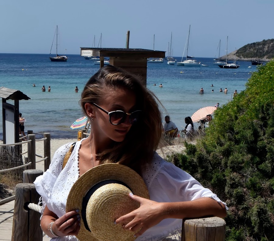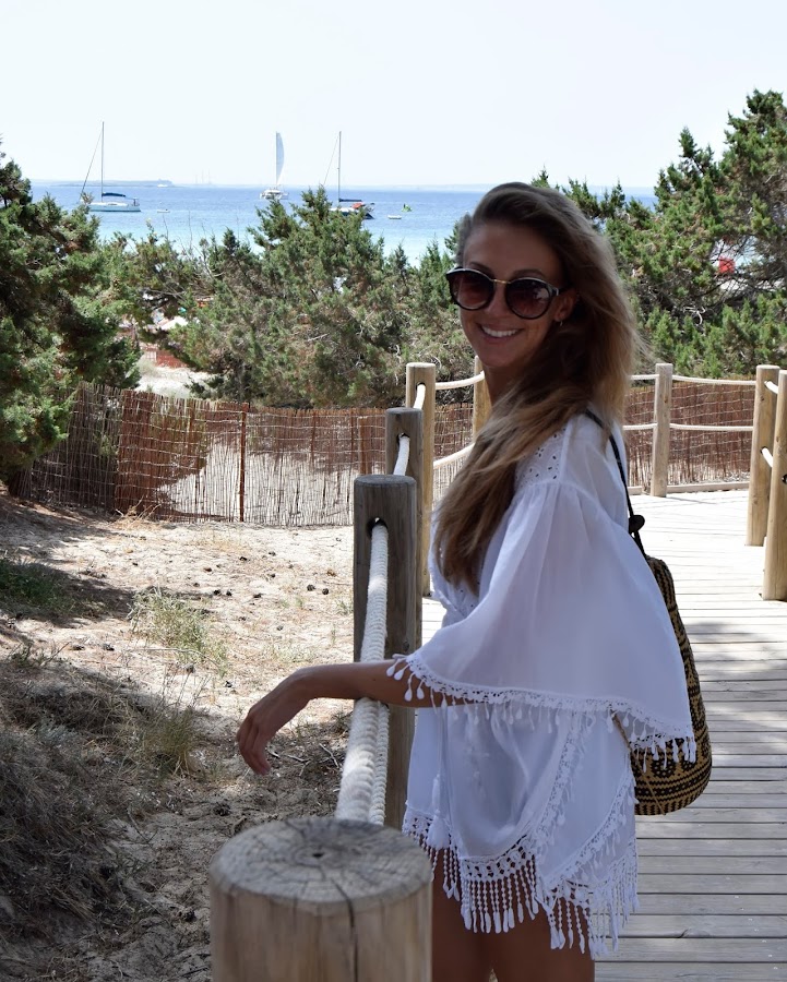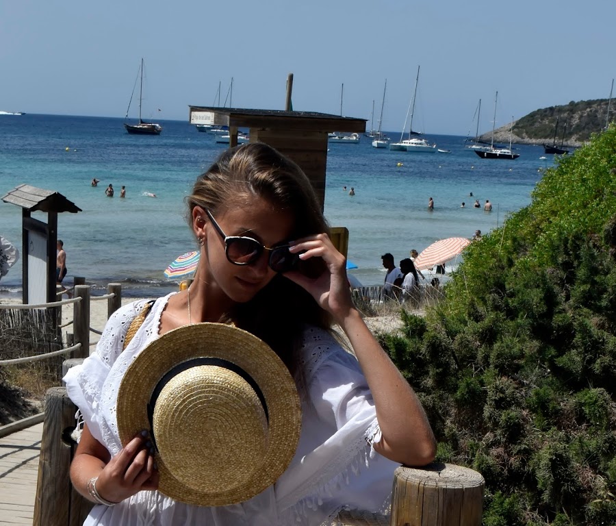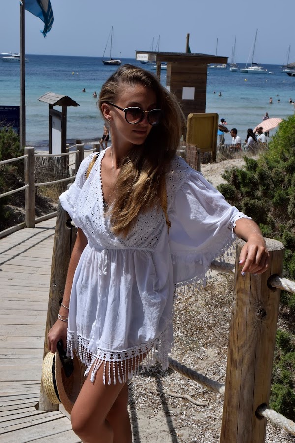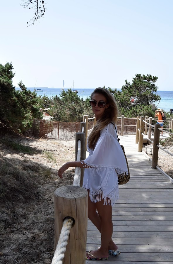 Para ir a la playa elegí un outfit boho chic tan de moda en la isla (si quereis saber mas del estilo leer el post de Trendyadvisor) y como no de blanco, porque algo en esta isla te incita a este color, con una camisola blanca de flecos y shorts.