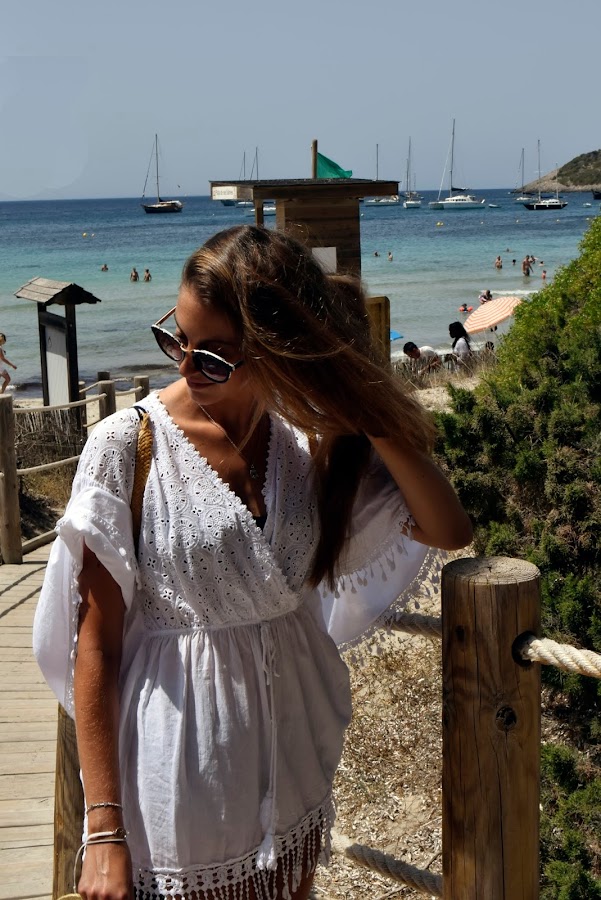 Para ir a la playa elegí un outfit boho chic tan de moda en la isla (si quereis saber mas del estilo leer el post de Trendyadvisor) y como no de blanco, porque algo en esta isla te incita a este color, con una camisola blanca de flecos y shorts.