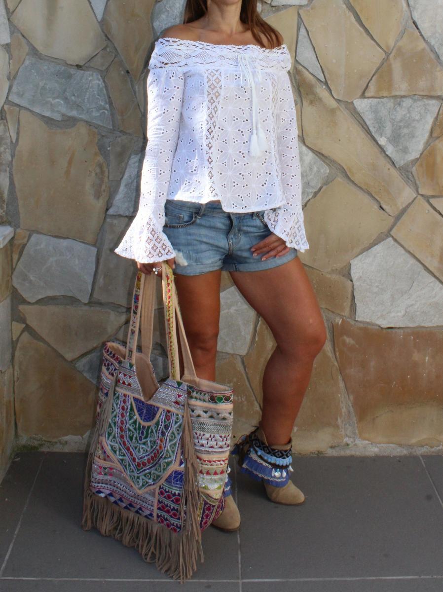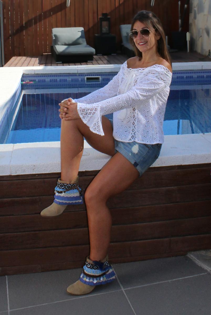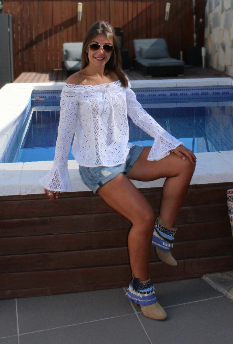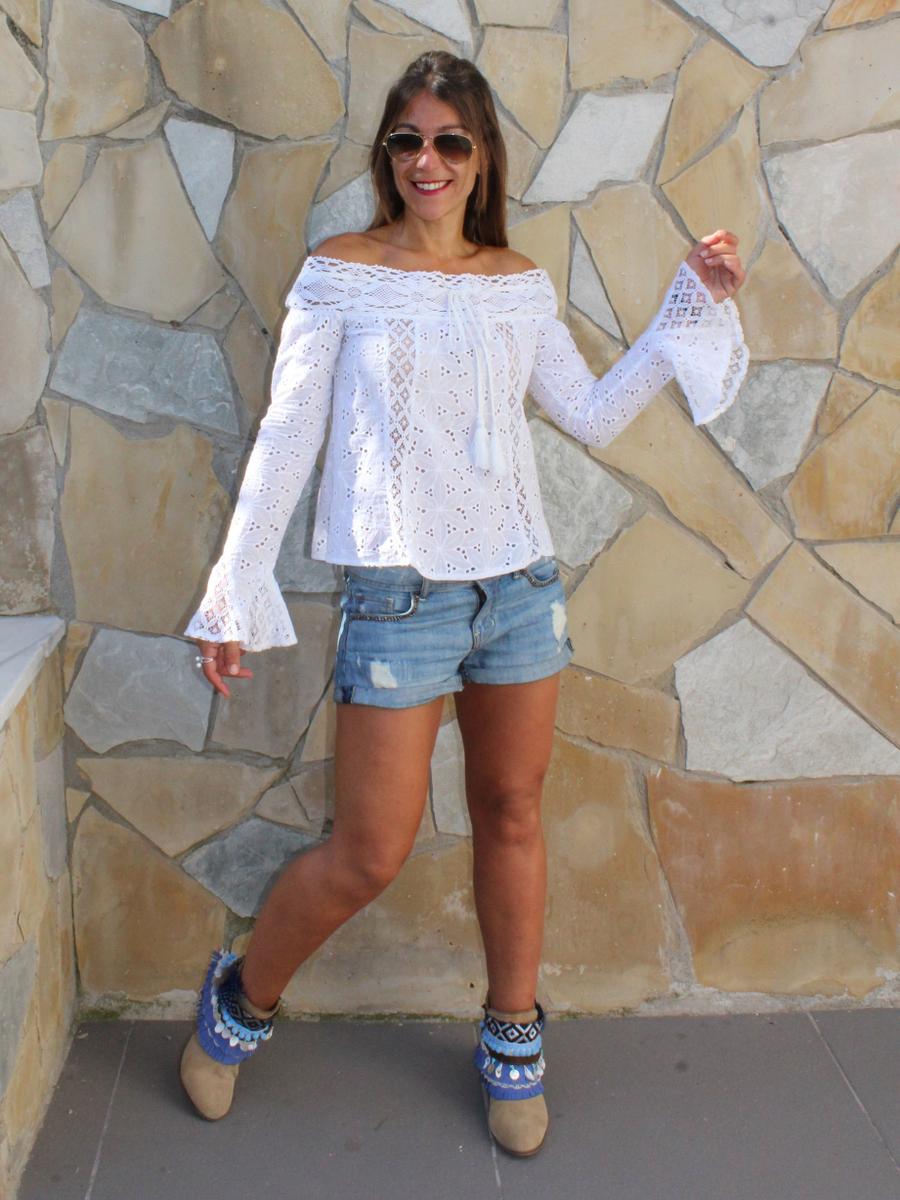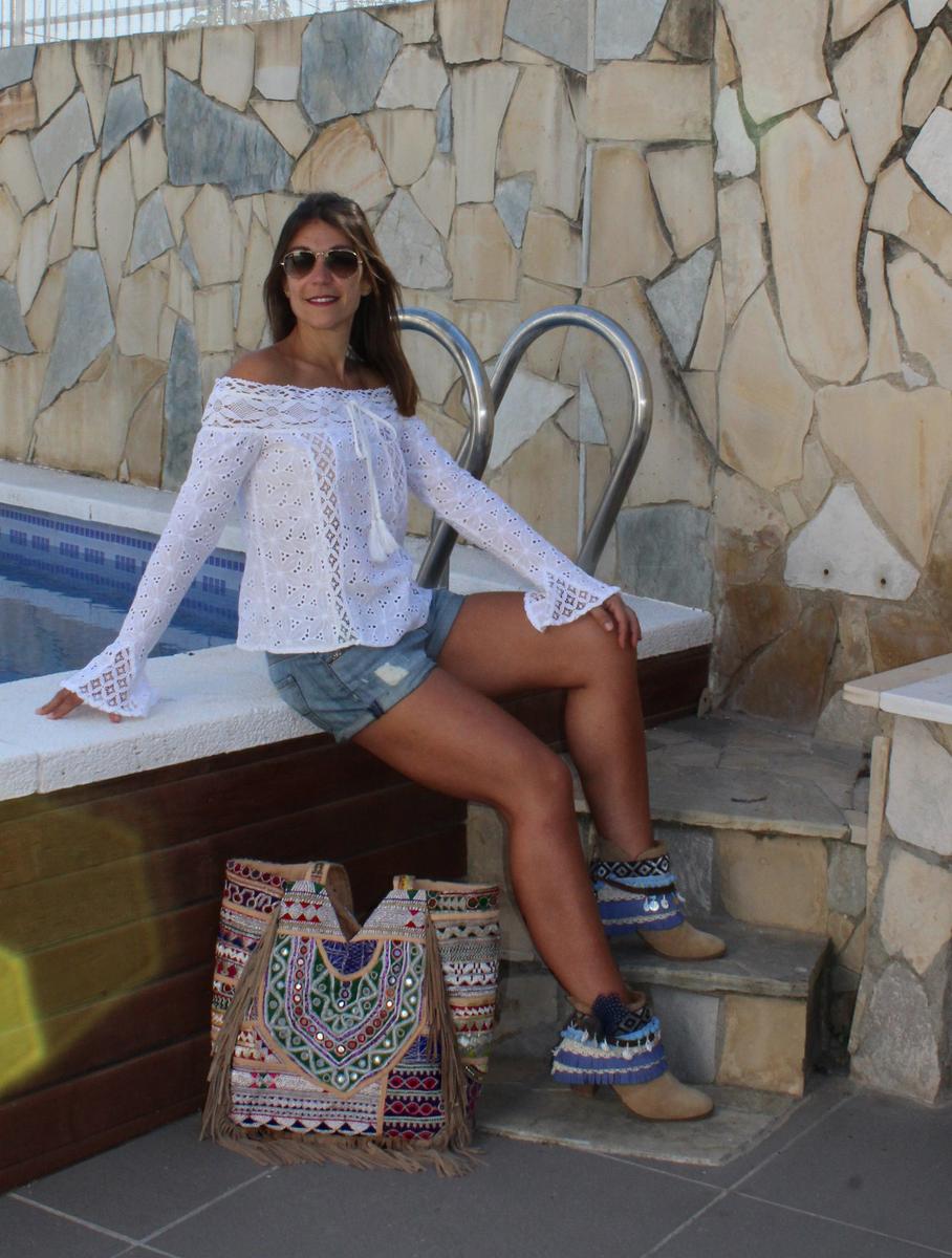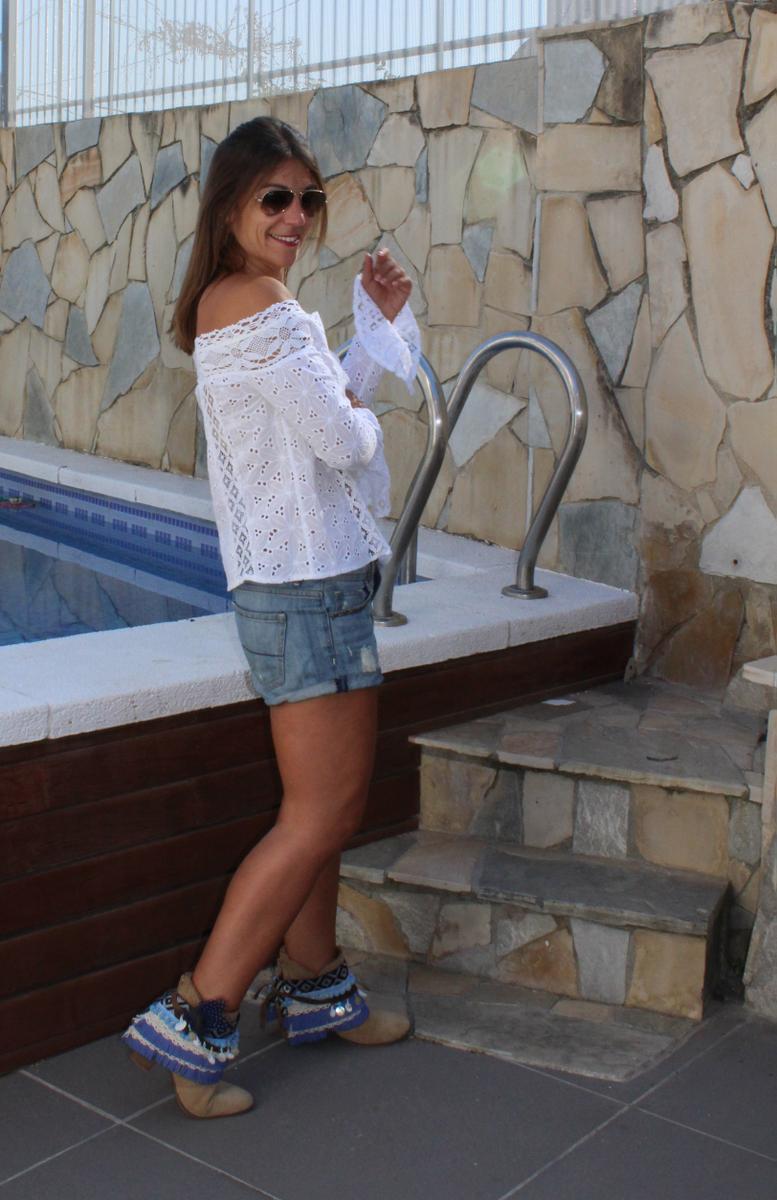 La composición de mi look de hoy lleva un poco de todo esto, una camisa de SHEIN de encaje, con unas bonitas mangas ajustadas, pero que a la altura de la muñeca se ensanchan para forman un pequeña y graciosa campana y con un favorecedor escote que deja los hombros completamente al aire. Para la parte de abajo elegí un short en tono azul desgastado, y como no podía ser de otra manera para conseguir un auténtico ethnic style, lo importante son los complementos. En este caso opte por botines adornados con un cubrebotas, que aunque se llamen cubrebotas, no tienen que ir necesariamente en este tipo de zapatos, ya que los puedes adaptar al calzado que más te guste, como por ejemplo las sandalias consiguiendo un aire renovado en tus zapatos. Al hombro llevo un auténtico bolso banjara traído de la India, que además de bonito es super cómodo ya que puedes llevar en él infinidad de cosas, además de su versatilidad, que te permite adaptarlo a cualquier situación, para ir a trabajar, de compras, o incluso para llevar los enseres de un día de playa o piscina.