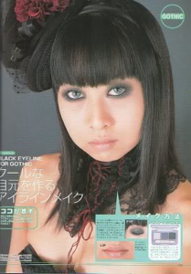 En esta imagen, la modelo se ve con aspecto Gothic; aunque puede ser tambien Ero lolita por su escote o aristocrat. Su maquillaje es gothic con un toque sweet; se usarón sombra negra en los ojos esfumandolos alrededor de el. Se hace una capa no muy oscura, solo para que se denoten mas los ojos. Aquí se da laopción de delinear los ojos o no, ya que con la sombra ya se ven definidos los contornos de los ojos, en este caso se usa una mascarilla de pestaña cafe quemado o negro. En sus labios se observa un gloss rosado o natural. Su cabello lleva un corte moderno y planchado. Como dije anteriormente, este estilo es usado dependiendo de la persona, claro, esta orientado mas que nada a lo Gothic con un toque de elegancia.