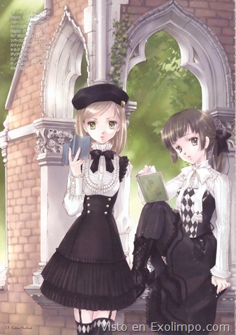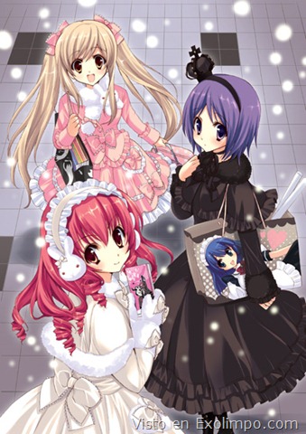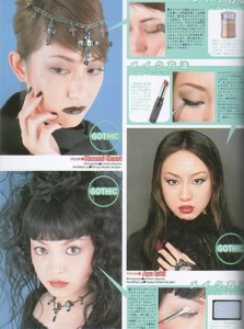 En esta imagen las 3 modelos estan orientadas al estilo Gothic lolita. En las 3 modelos se observan los mismos procedimientos en los ojos; los cuales son: difumina o esparce un poco de sombra gris en el parpado sin sobrecargar la pintura, debe ser tenue. En el caso de la modelo de arriba izquierda se hizo lo mismo, solo que se aplico sombra color cafe claro. Luego se definen los ojos con un delineador negro solo en la parte de arriba, ahora usando una mascara de pestañas cafe oscuro para que los ojos resalten mas. En dos de las modelos se uso un labial liquido rojo y en la otra se uso un color negro. Estos colores oscuros en el rosto, hacen alución a los gothic, aun cuando se usa el rojo en los labios también es para Gothic Lolita.Ya sobre el peinado, cada una tiene un estilo diferente; una lleva un moño atras, otra lleva el cabello sujetado con un gancho en la parte superior tomando un poko de cabello risandolo y otra lo lleva ondulado ó natural sin adornos en su cabello.