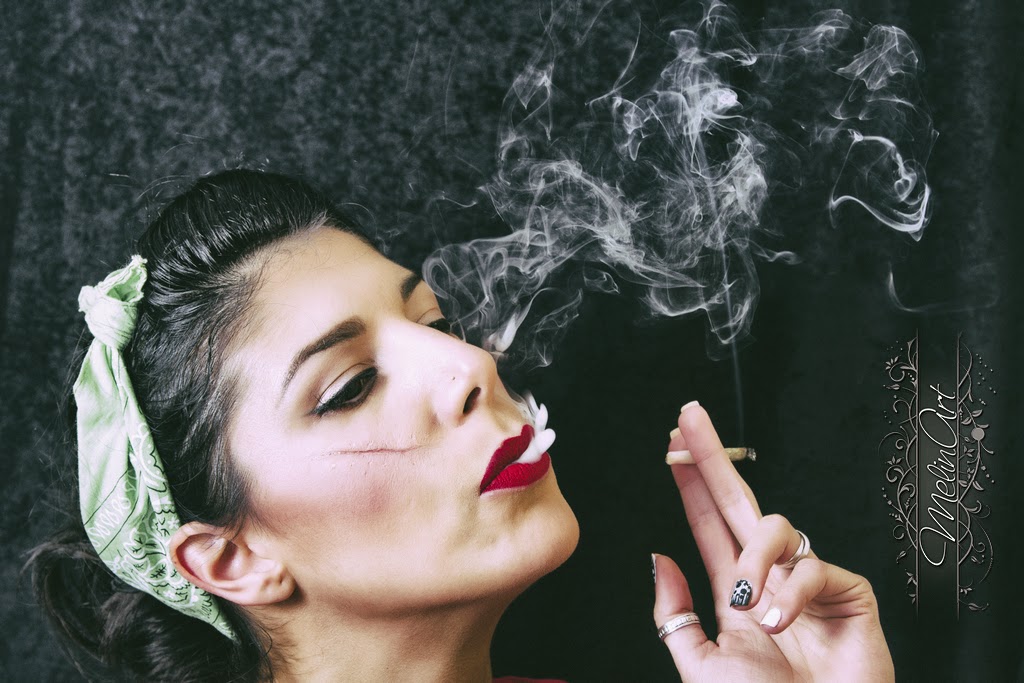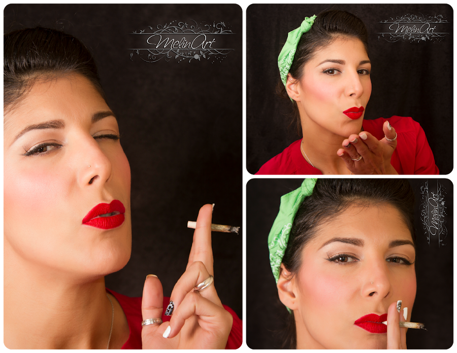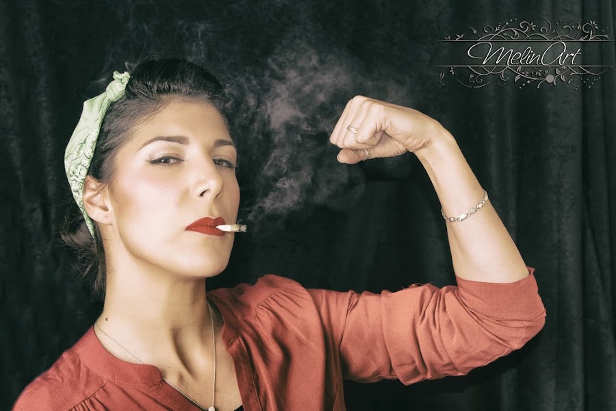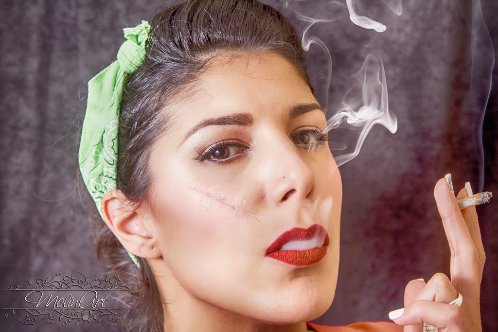 El resultado ha sido un look Pin Up estilo "We can do it", reflejo de aquellas mujeres que en la II guerra mundial se hicieron cargo de sacar adelante el trabajo en las fábricas mientras los hombres iban al frente. Para darle todavía más personalidad he utilizado el humo del cigarro (me encanta el resultado!!!) y también añadí a posteriori una cicatriz en el pómulo (vestigio de a saber qué guerra) que espero se aprecie en alguna de las fotos. Me gusta el carácter que le añade.