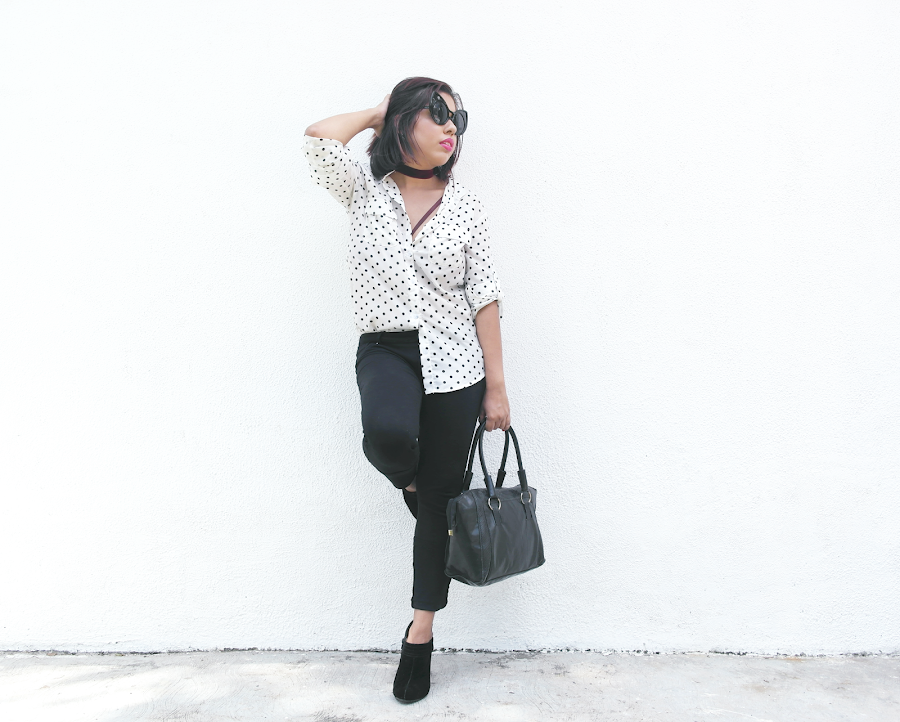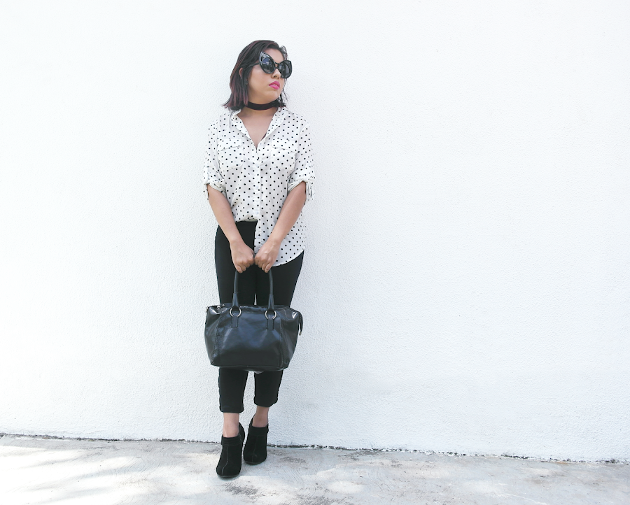 Para el look de hoy, estoy utilizando una blusa con estampado polka dots, lleve las mangas a ¾ para darle un toque descuidado y metí solo un lado dentro de los pantalones para que mi cintura se viera un poco, pero sin márcala demasiado. Un pantalón negro, al cual le hice un maxi dobladillo para lograr también un estilo cropped, lentes de sol (el accesorio catlove fijo) y chokers, que son mis accesorios favoritos de la temporada.