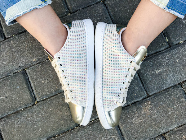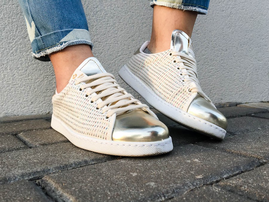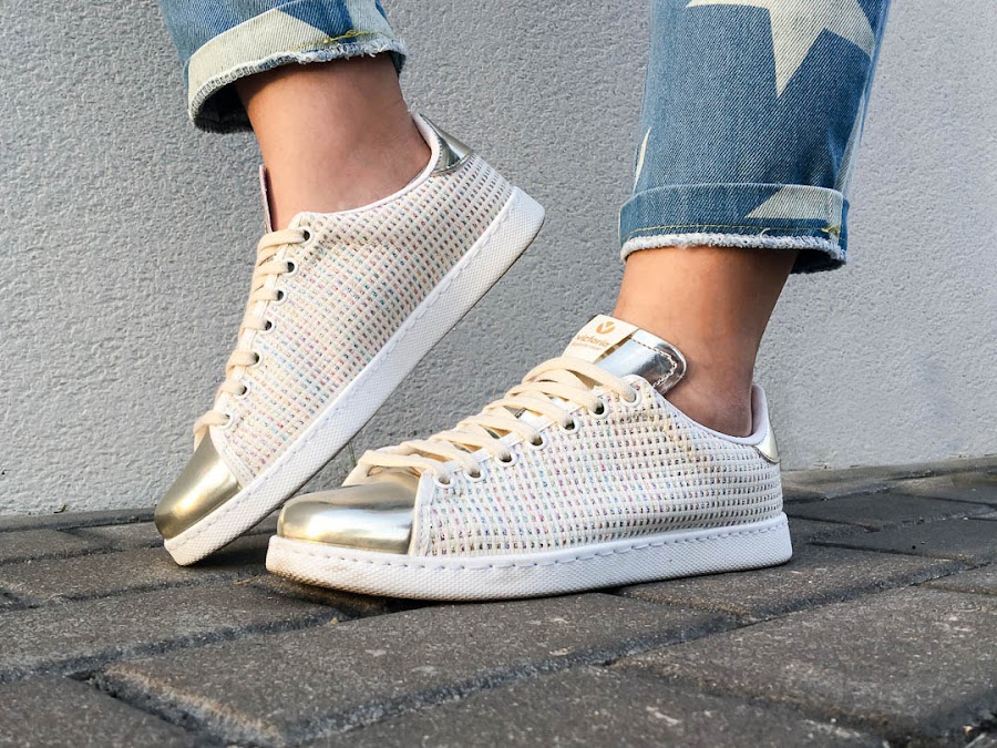 Lo he combinado con una blusa blanca de volantes y mis nuevas zapatillas, súper molonas, de color beige clarito combinando con dorado y unos detalles de hilos de colores. No hay ni que decir que son súper cómodas!!