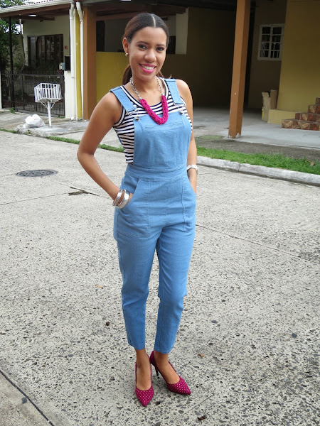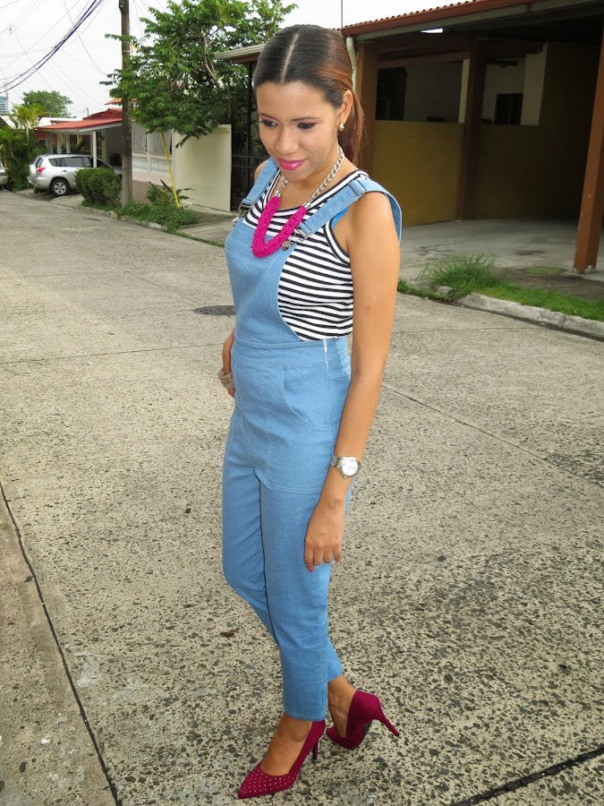 El overol de denim es la prenda focal de este look, el cual acompañe con una camiseta de rayas blancas con negro. Para darle más vida al look le incorporé un collar de cuentas entrelazadas en color fucsia y unos zapatos de tacon de la misma gama de color. También utilicé unas pulseras y reloj en color plateado.