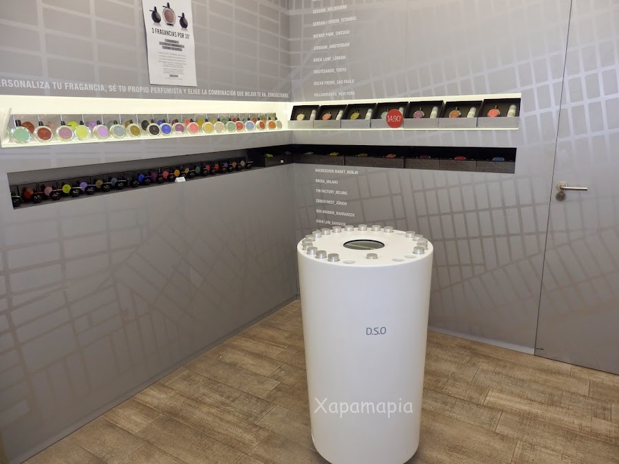 Cuando queremos oler una fragancia estamos acostumbrados (al menos yo) a utilizar para ello un papel secante en el que ponemos dicha fragancia.... pues eso en Etnia no es necesario... Los cilindros plateados que veis son las fragancias y si queremos olerla no tenemos mas que ponerlo en el agujero que esta separado del resto y la fragancia saldrá para que podamos olerla, ademas en la pantalla veremos las notas olfativas de la colonia.... me pareció muy curioso y una forma muy original de conocer las fragancias.