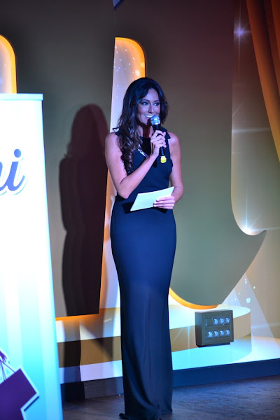 El segundo día, volví a vestirme de La Folie Avilés, pero esta vez con un conjunto negro de fiesta de dos piezas compuesto por falda asimétrica y cuerpo de encaje y pendientes tipo joya con cierre de clip, para lo cual, decidimos recoger la melena en un moño alto, muy desenfadado. Creo que debió de convencer más esta segunda opción, un tanto más festiva, porque el traje se vendió incluso antes de que me bajara del escenario.
