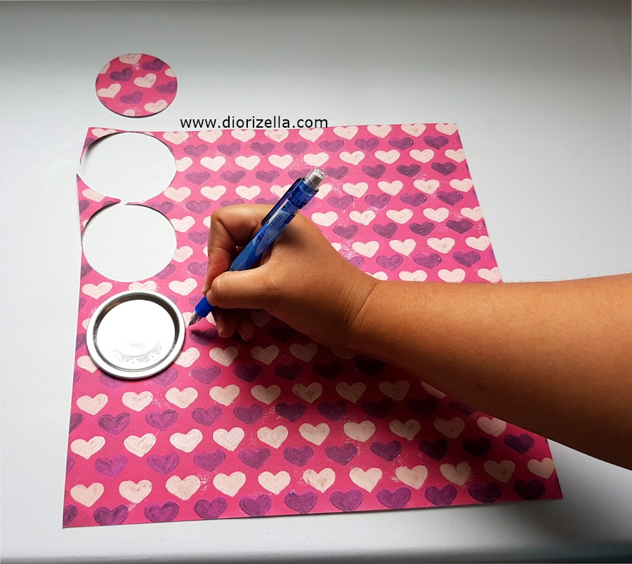 Traza la tapa del frasco en papel de scrapbook de la temporada de San Valentín o la ocasión que desees. Corta el circulo con la tijera y luego colócalos en la tapa de los frascos.