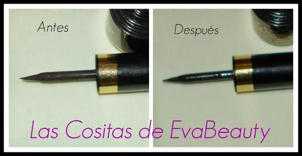 Apliqué un par de gotitas del producto dentro del eyeliner, lo cerré y lo moví un poco, y mirad la diferencia del aplicador, se nota un montón el antes y el después.