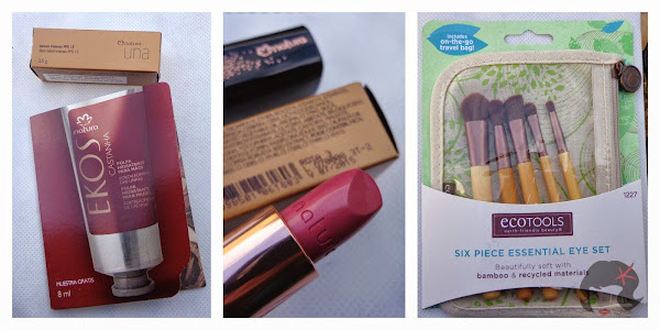 Un labial Una Natura, para ser exacta el Rosa 3, ya se los mostraré más en detalle, una muestra de la Ekos Castaña (la amo) y un juego de Ecotools, a mi me resultaba imposible conseguir Ecotools porque las vendían en Carrefour y en el de cerca de casa no había, así que cuando pensaba que no las iba a tener Camila compró un juego de más y pude acceder a ellas!!