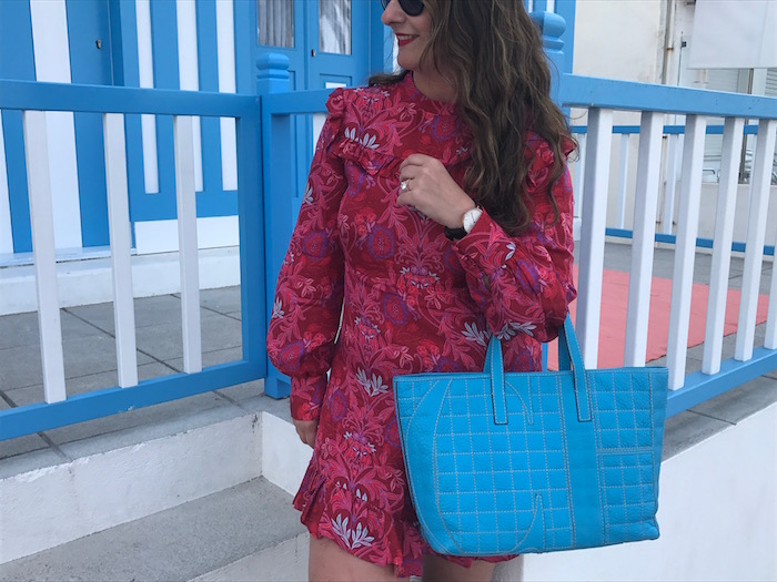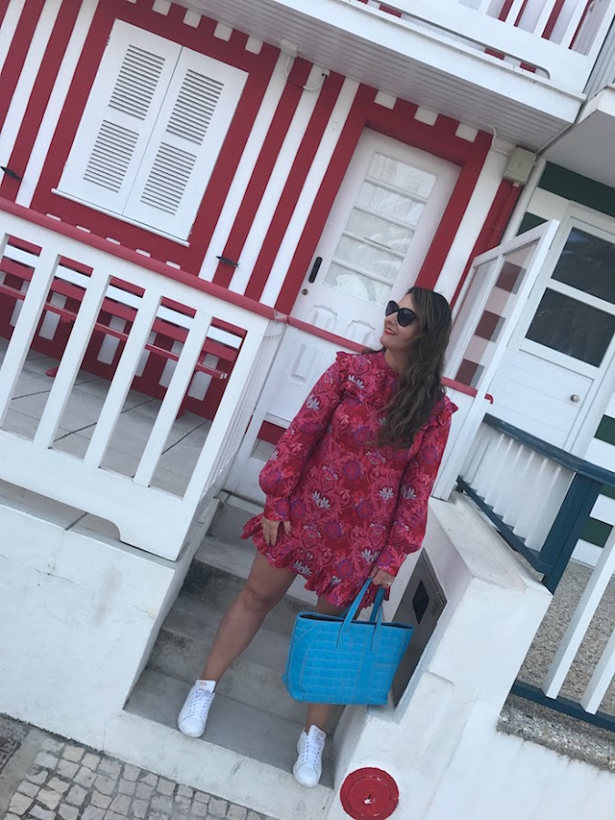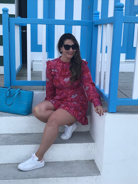 El look que elegí fue un vestido en color fucsia con estampado en flores de diferentes rosas y turquesa que combiné con deportivas Adidas Stan Smith con detalle rosa palo y coco en la piel. Como bolso, maxi shopping en color turquesa.