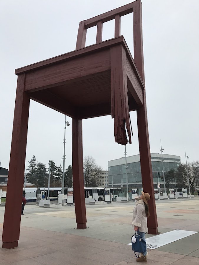 De ahí nos dirigimos a ver la sede de la ONU y la Plaza de las Naciones, donde se encuentra la famosa silla con una pata rota, que denuncia los desastres hechos por las minas anti persona.