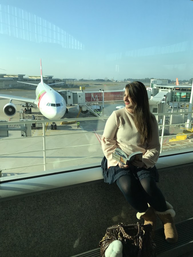 El look que llevé para el viaje, fue algo cómodo ya que eran bastantes horas. Vestido en color azul marino y jersey en color rosa empolvado con mangas acampanadas encima, ya que el frío era bastante intenso.