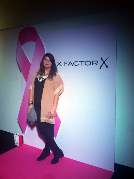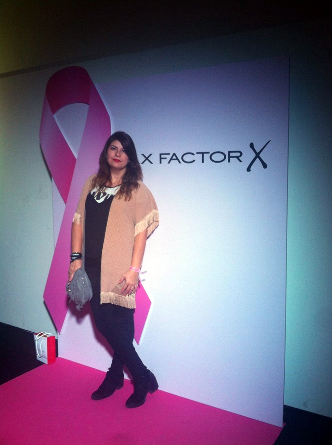 En el Stand de Max Factor, posando en el photocall con un lazo rosa contra el cáncer de mama y apoyando la causa