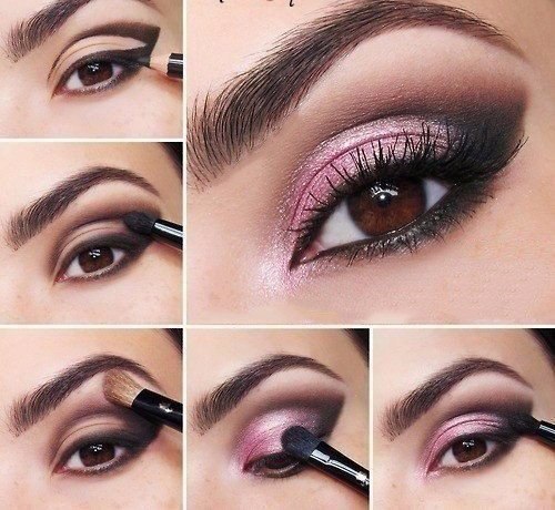 Paso n°6.- No olvides colocar un poco de sombra rosa sobre el lagrimal para darle luz al maquillaje. Luego difuma bien.Por último coloca máscara para pestañas negra.