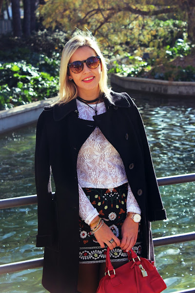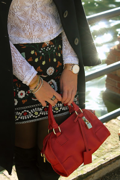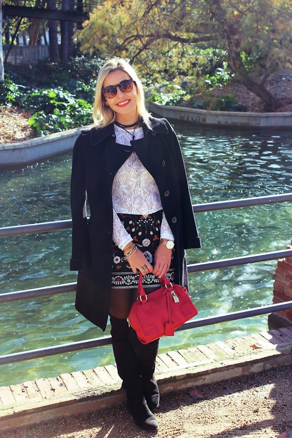 Today I want to show you my new embroidered skirt, one of the trends of this season, that I liked since the first time I saw in Zaful. I wore it with a white lace tee and a black coat. The accessories of the outfit were black boots over the knees, a red bag and my new black chocker.