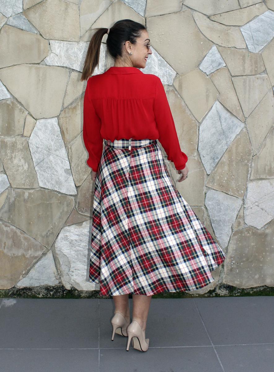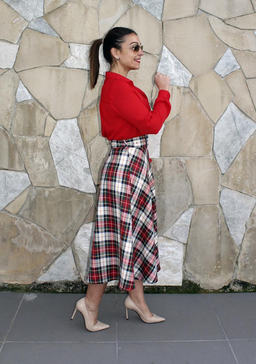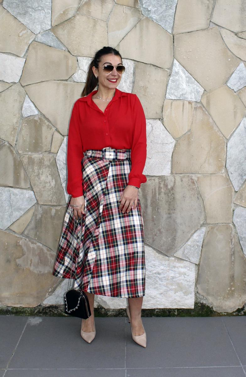 En mi look de hoy llevo una en estampado de cuadros, una de las reinas esta temporada, combinada con una camisa roja y salones en color nude.