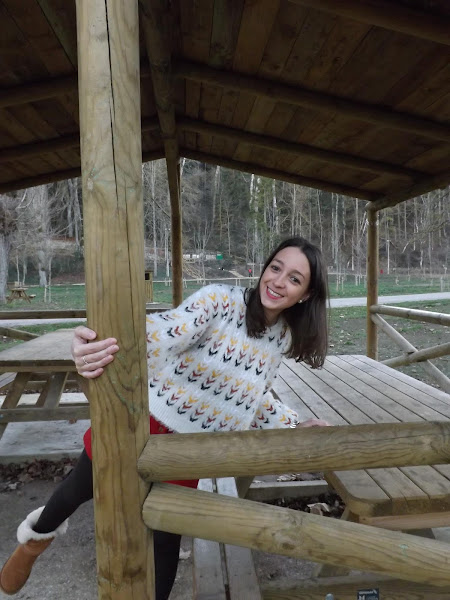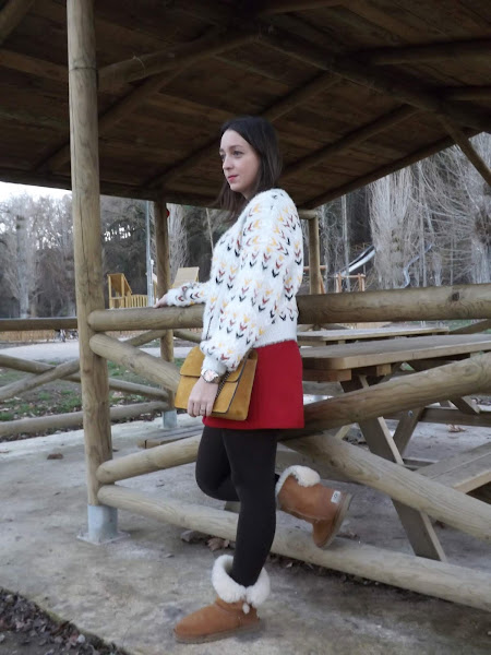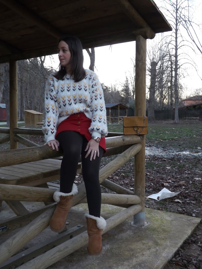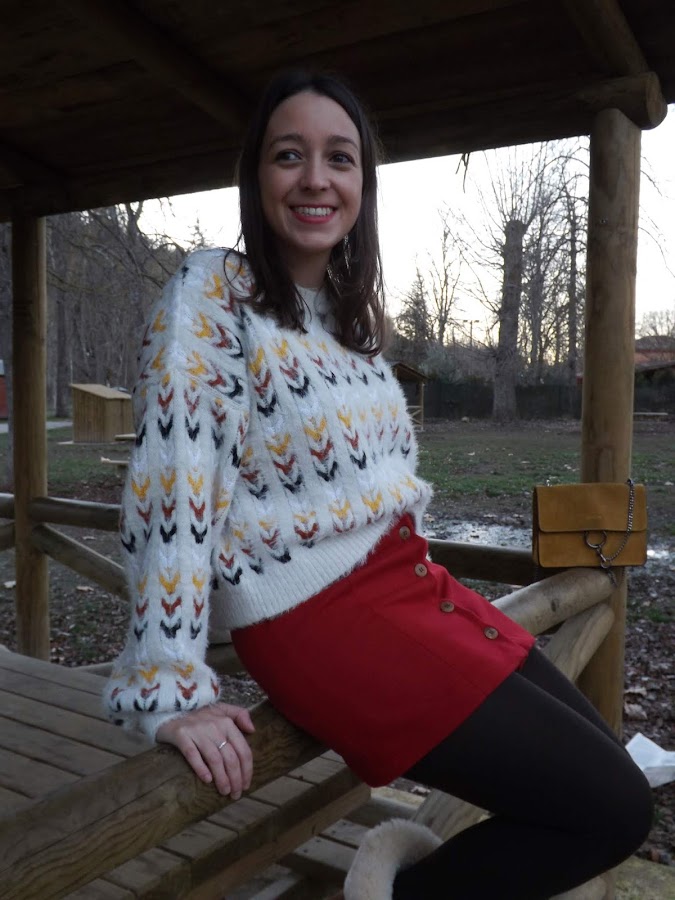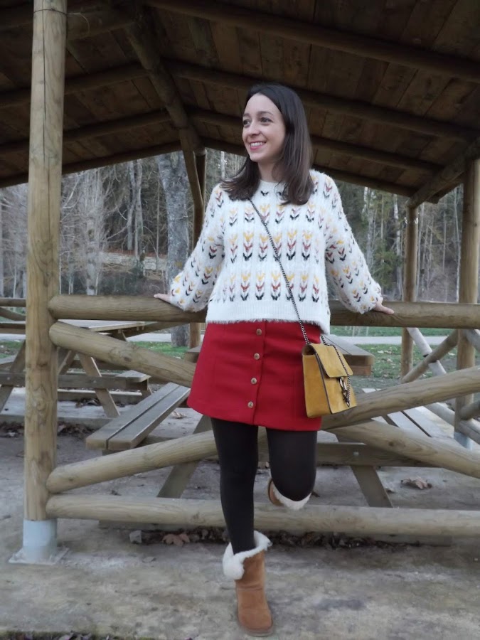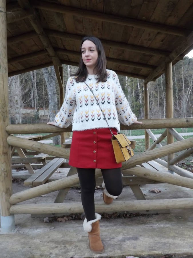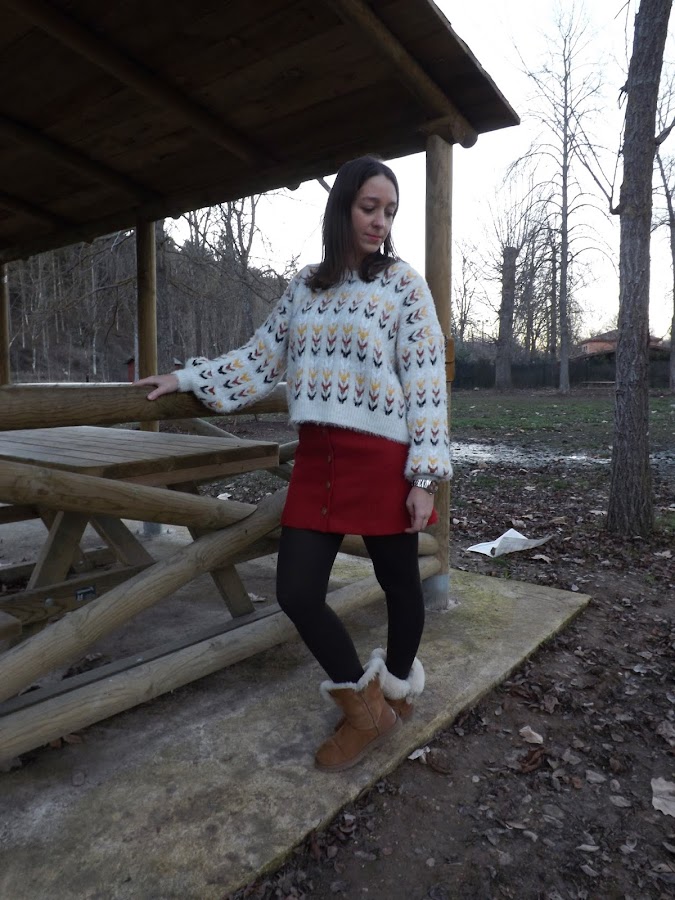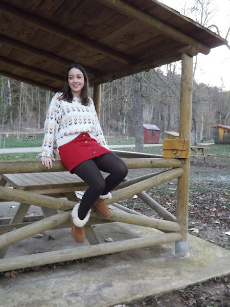 La falda es creación mía, de paño en rojo oscuro, con cortes y botones de madera en el centro, no me digáis que no es bonita! Además con este jersey nuevo de Stradivarius queda de maravilla. Un look abrigadito para este invierno.