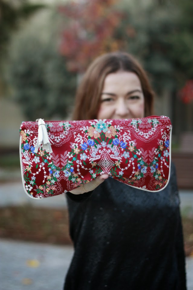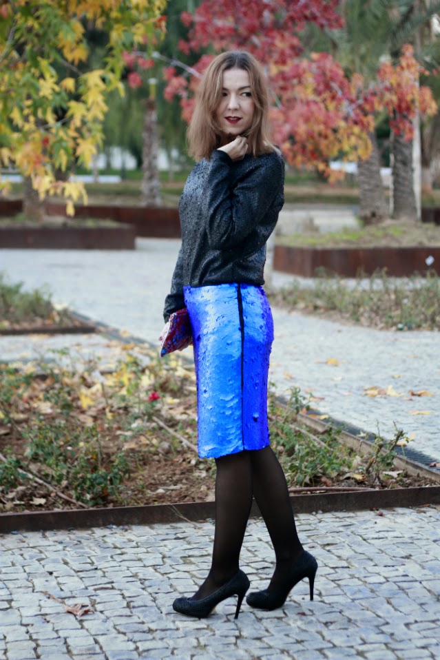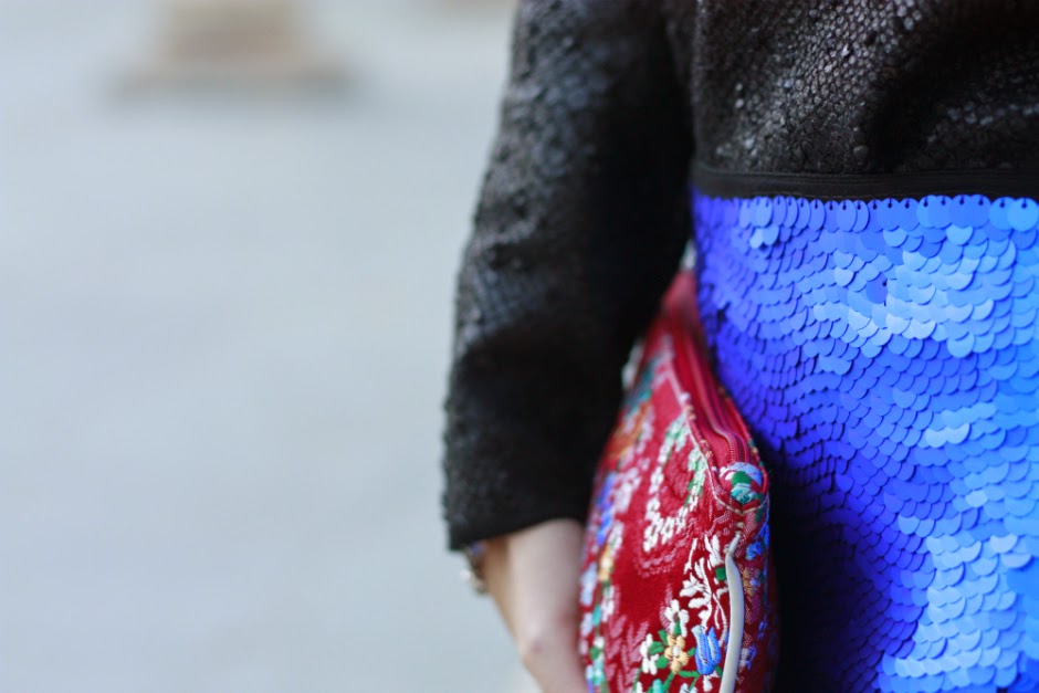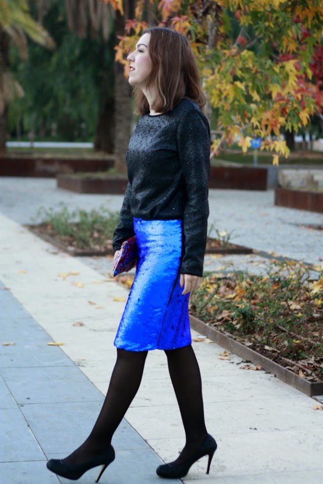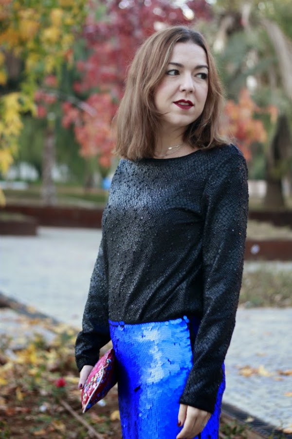 Este look lo elegí para la primera fiesta navideña a la que asistí, que fue una cena en la falla para celebrar la llegada de estos días pero el look me parece ideal tanto para las reuniones familiares navideñas como para nochevieja, con prendas a temporales que no pasan de moda y colores muy favorecedores como son el negro (es uno de los básicos de mi armario) y la falda azul nada discreta de lentejuelas.El otro toque de color e incluso el punto de distinción, si me lo permitís, es el cluch. Los complementos siempre son importantes, pero si además son piezas tan especiales como este, realizado con la mama tela que se confeccionan los trajes de valenciana mucho más. La riqueza de colores y sobre todo, la elaboración del dibujo hacen tanto de este bolso como de todos los de esta marca, piezas únicas, elegantes y que no dejan a nadie indiferente.