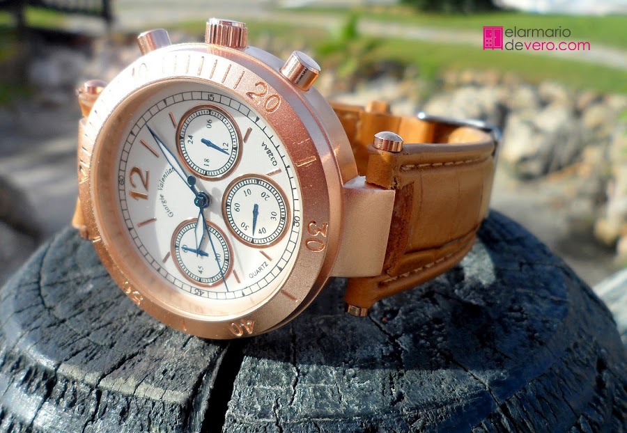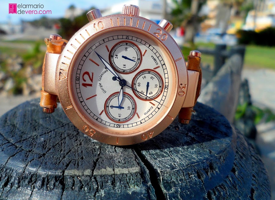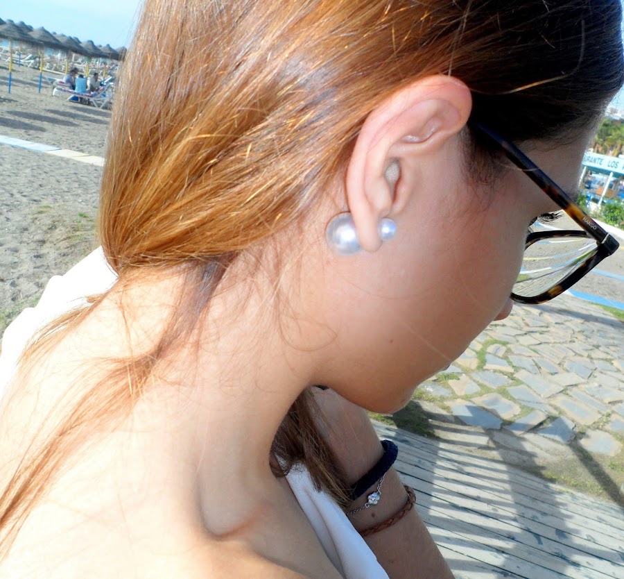Para rematar el look, he usado un bolso en tonos beiges y dorados haciendo juego con el reloj. Y por supuesto, hay que destacar los pendientes de doble perla, que están ahora tan de moda.