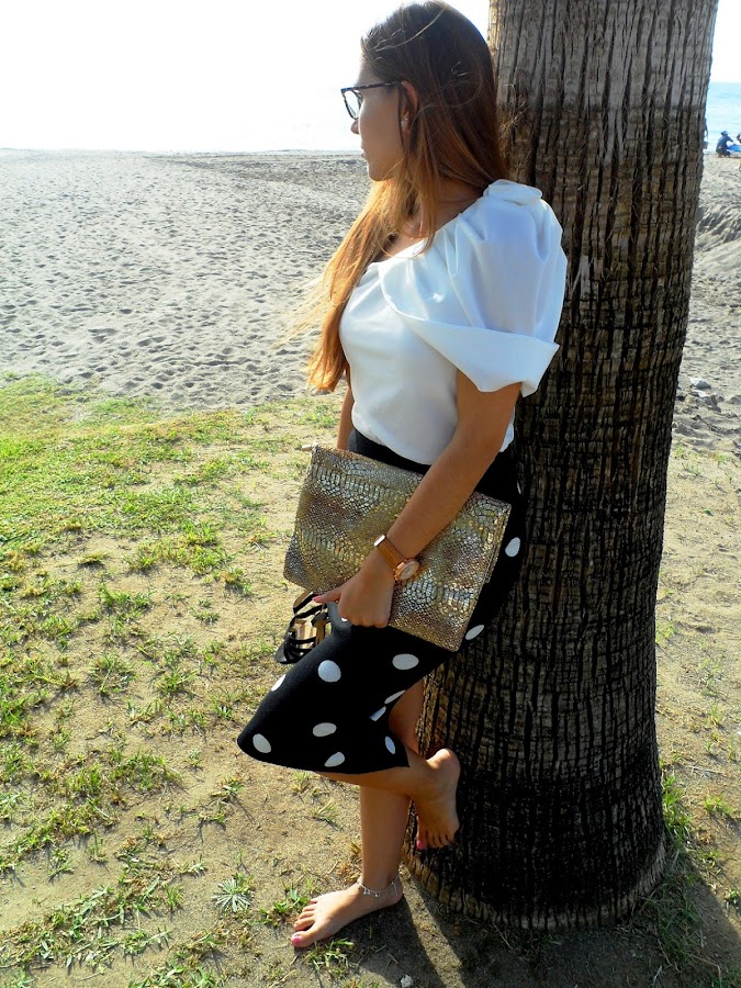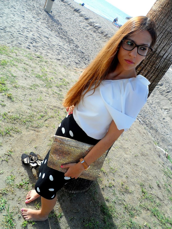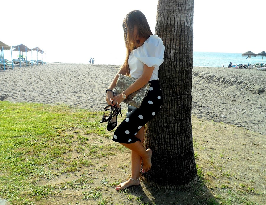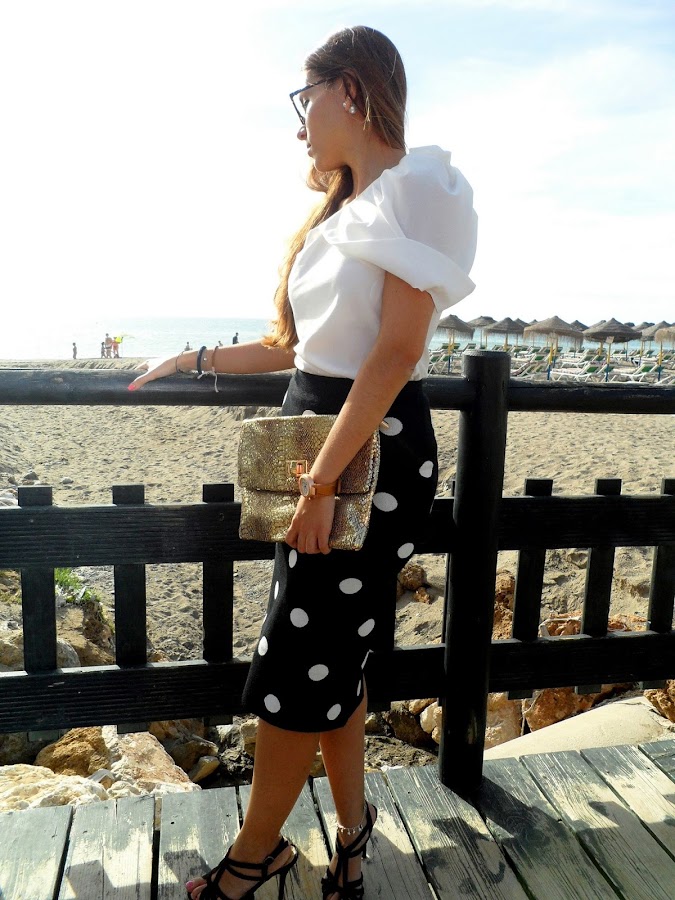 Después de un fin de semana irrepetible que me ha servido para desconectar y poder despedirme del verano como se merece, empezamos la semana con energía. Hoy os traigo un look donde los protagonistas son los lunares, con esta falda de punto en blanco y negro, y con una apertura muy sexy en la parte trasera. Queda súper bien, porque se ajusta al cuerpo y se adapta perfectamente.
