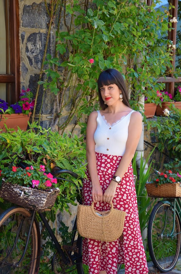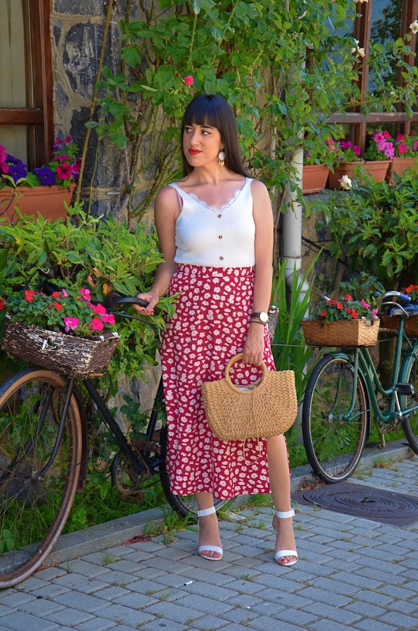 Por otro lado, la maxi falda roja, con estampado de margaritas y abertura en la zona frontal, es una prenda muy femenina y que estiliza un montón. Sienta como un guante y es super alegre.