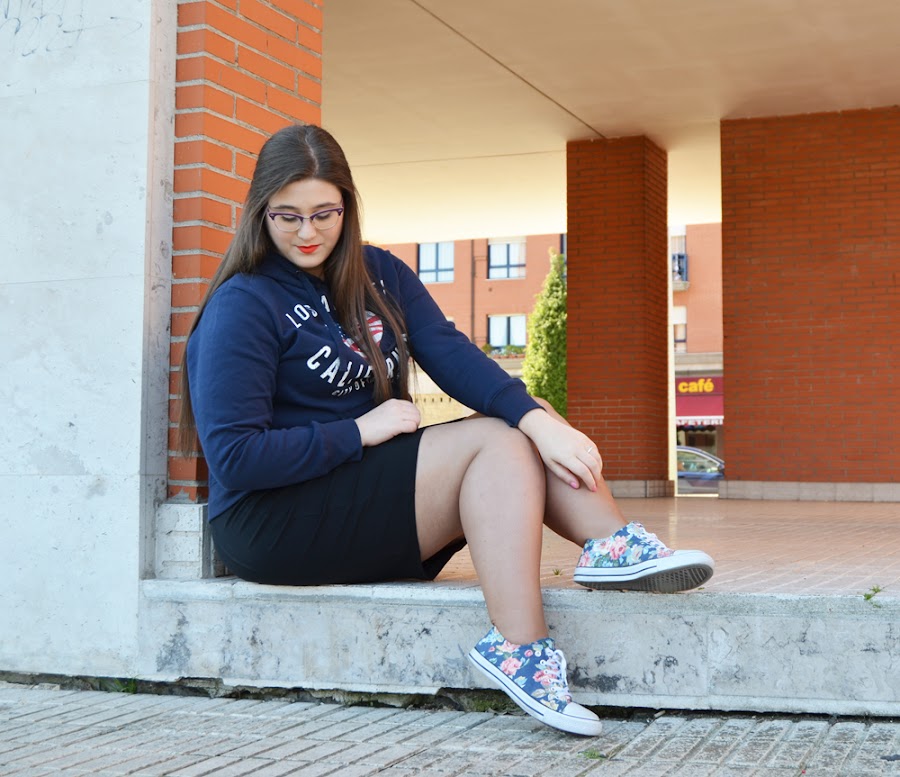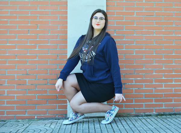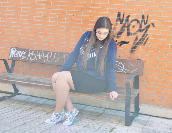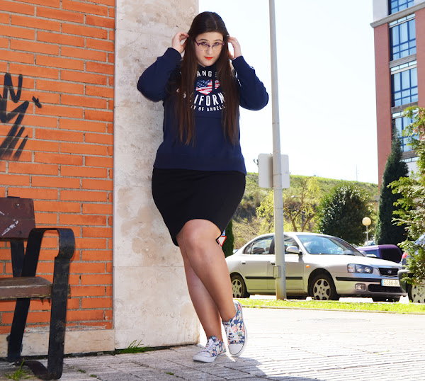 Creo que una falda de este estilo, es ideal para conseguir desde el outfit mas arreglado y formal, hasta el mas casual y desenfadado. Como hoy, con unas bambas de flores y una sudadera.