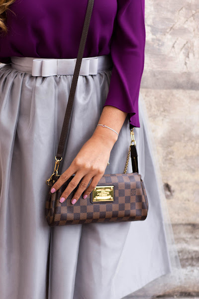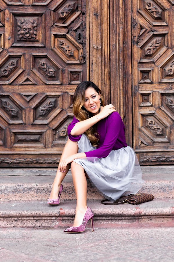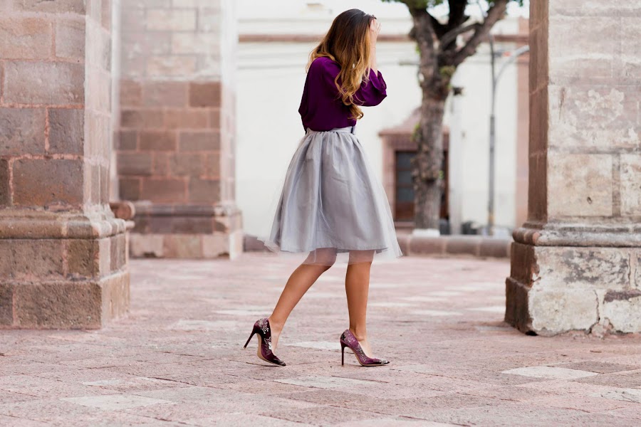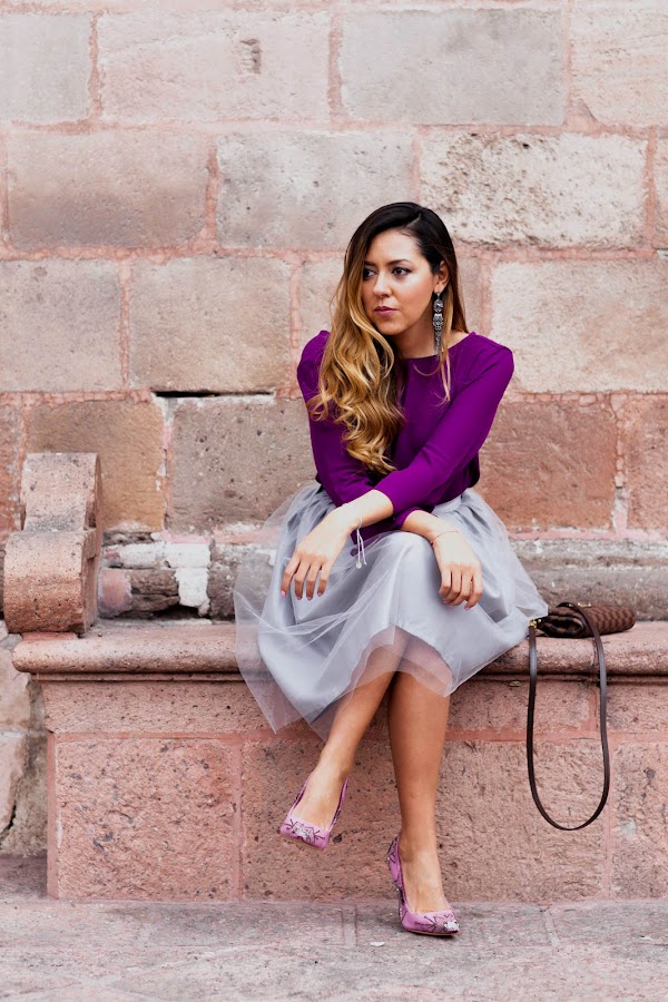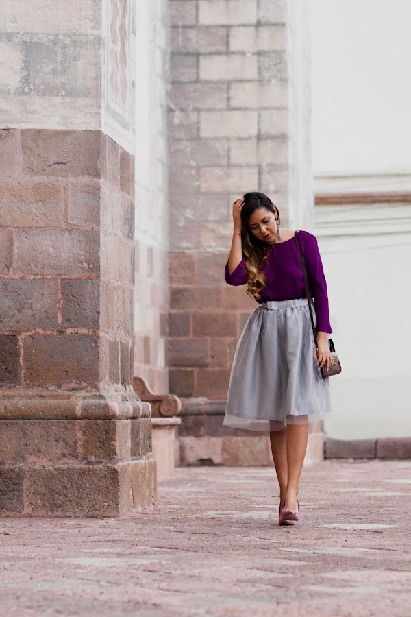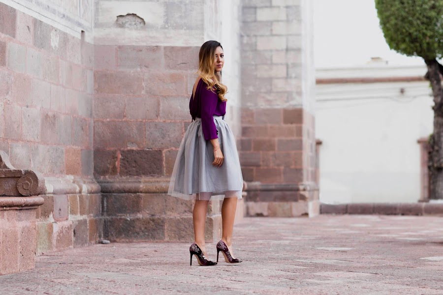 Quienes ya me conocen saben que tengo un guardarropa y unos gustos bastante variados pero aún así creo que tengo un estilo definido y es que a lo que me ponga le pongo el toque femenino porque de verdad disfruto vestir con esos elementos y hacer mías las prendas. En esta ocasión estoy usando por completo un Lady Look, no cabe duda que es femenino, romántico y elegante. La prenda principal es la falda de tul en color gris de la marca Philippas Closet la cual tiene una línea para mujer además de ropa hermosa para niños, de verdad que tienen que verla porque tiene un aire de antaño que simplemente van a amar. Decidí combinarla con una blusa en color morado y unas zapatillas del mismo color, añadiéndole un toque sexy como el collar en la espalda y así aprovechar el escote.