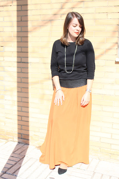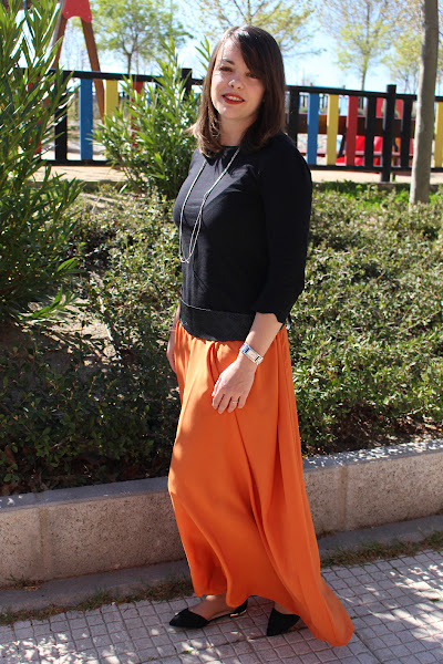 El naranja me parece un color muy llamativo y alegre y este ha sido el color elegido para la falda larga, y así la he combinado.