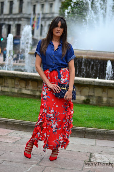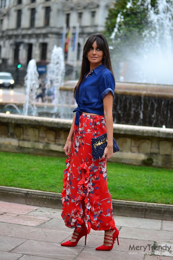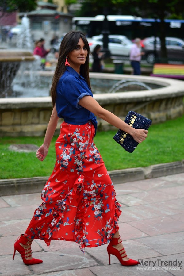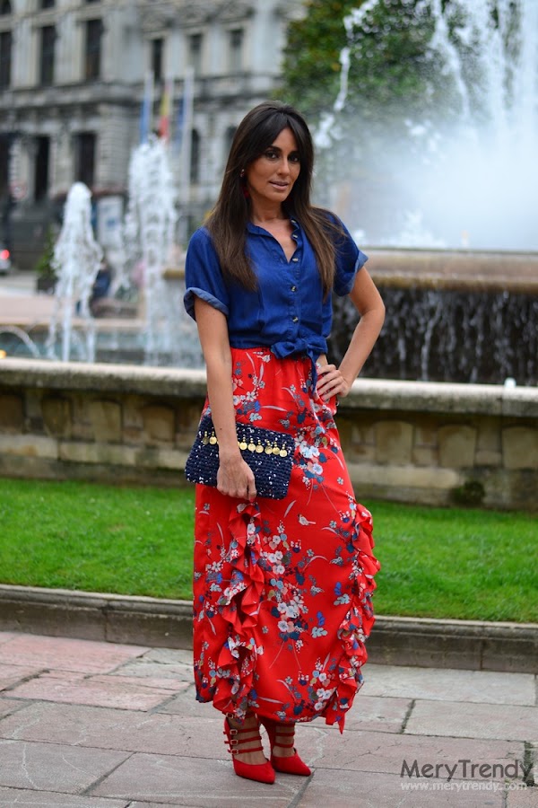 Recta, de satén, en color caldera, con estampado oriental y dos aberturas rematadas con un volante... Para mí, la falda perfecta. ¿No os parece?