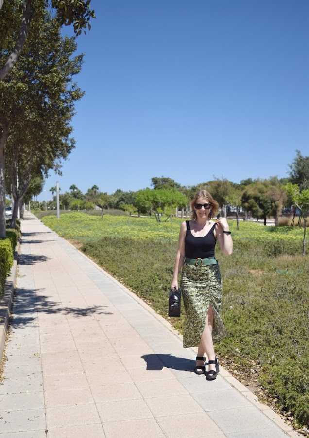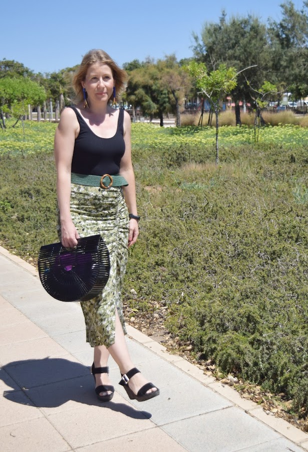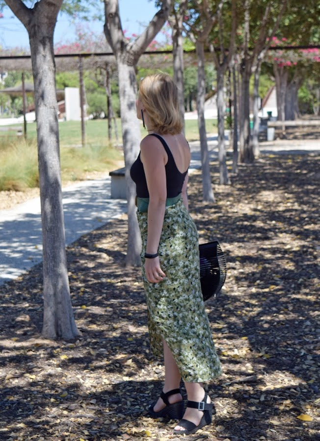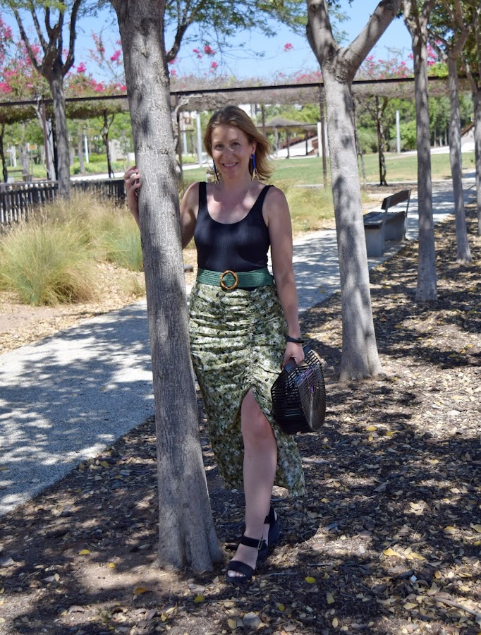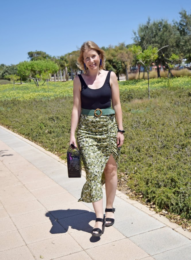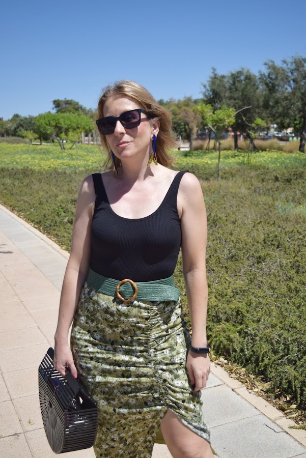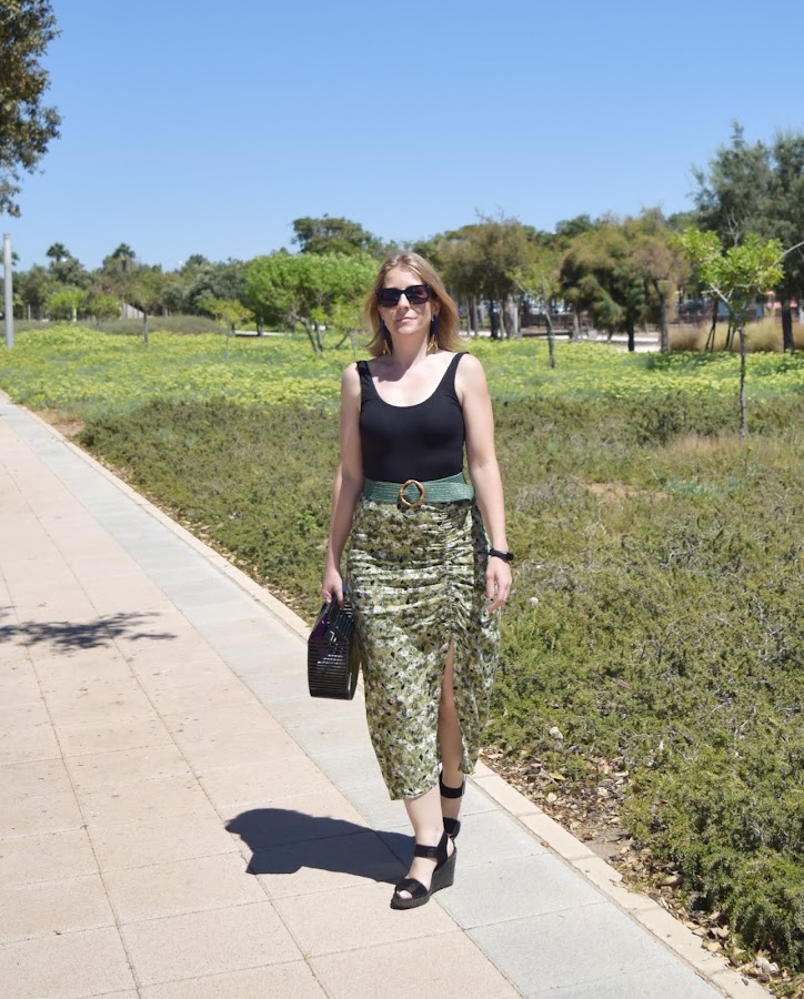 No me voy por las ramas. La falda es un básico de cara al otoño, con unos tonos verdes y flores que la hacen perfecta para llevarla con sandalias o con botas altas, cambiando el body por un jersey o blusa negra de manda larga.