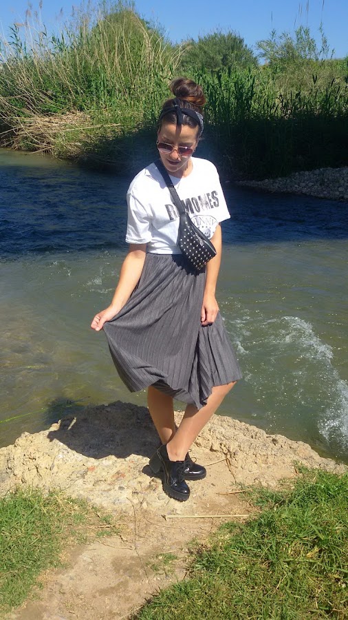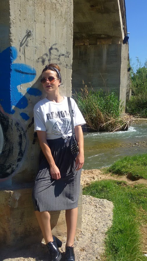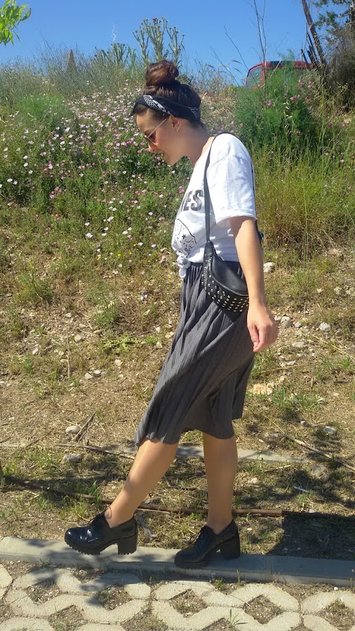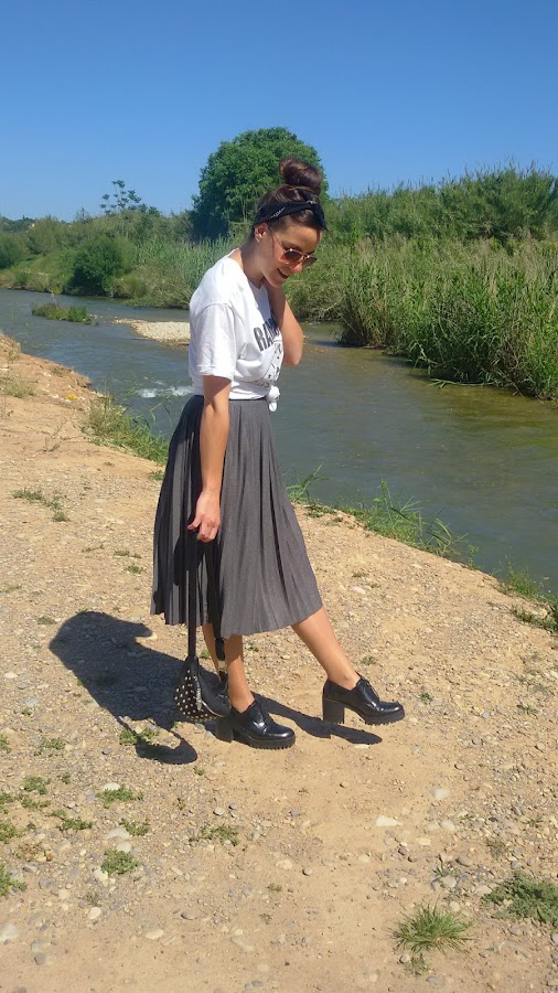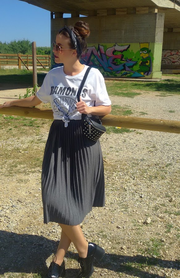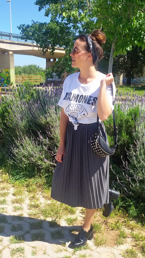 He combinado una falda midi de tablas, con esta camiseta de Los Ramones anudada para que me quedara más ajustada y corta.