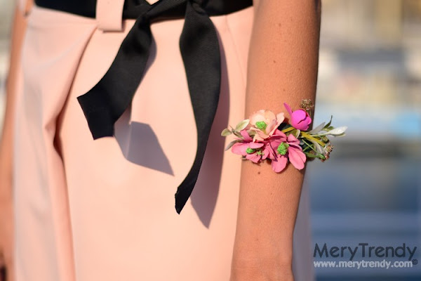 El punto de sofisticación, se lo di con esta pulserita de flores (también de "El Vestidor de Angelina") que me llamó la atención porque hasta ahora solo había visto esta ornamentación con motivos florales de tela en cinturones y coronas, pero no en brazaletes. Además, me recordó a la típica que el chico le regala a la chica cuando va a recogerla a casa de sus padres para llevarla al baile de fin de curso (el Prom) en las pelis de instituto americanas... Jijiji.
