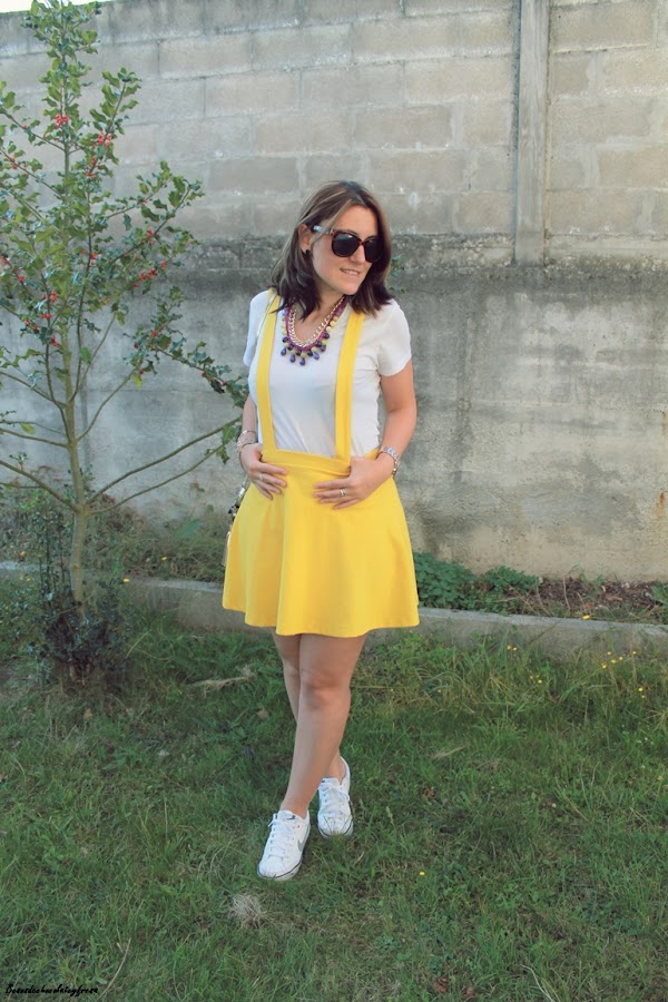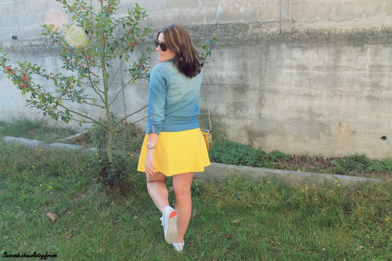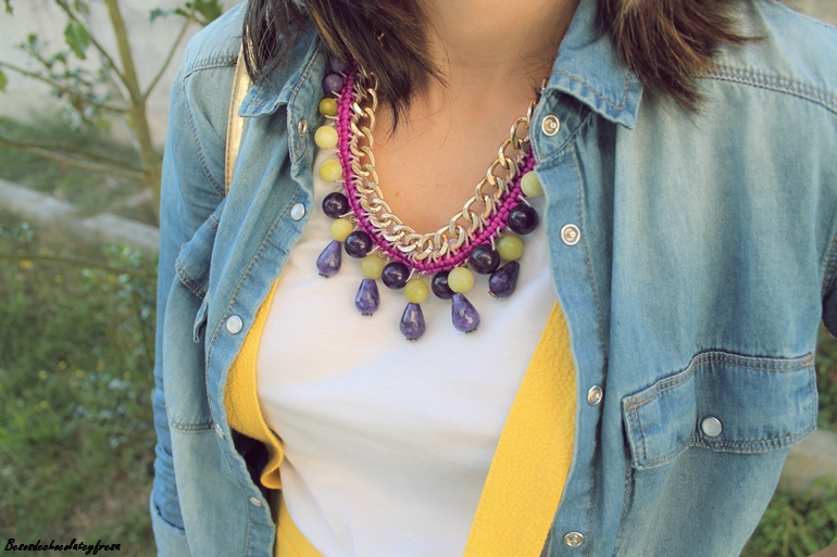 Decidí combinarla con camiseta básica en blanca de cuello pico para que resaltase bien el color amarillo con sneakers para darle un rollo casual y sport junto con la camisa denim anudada, bolso dorado, para añadirle un punto más de luz y brillo y collar colorido en tonos lilas y amarillos que rompe la monotonía de colores.