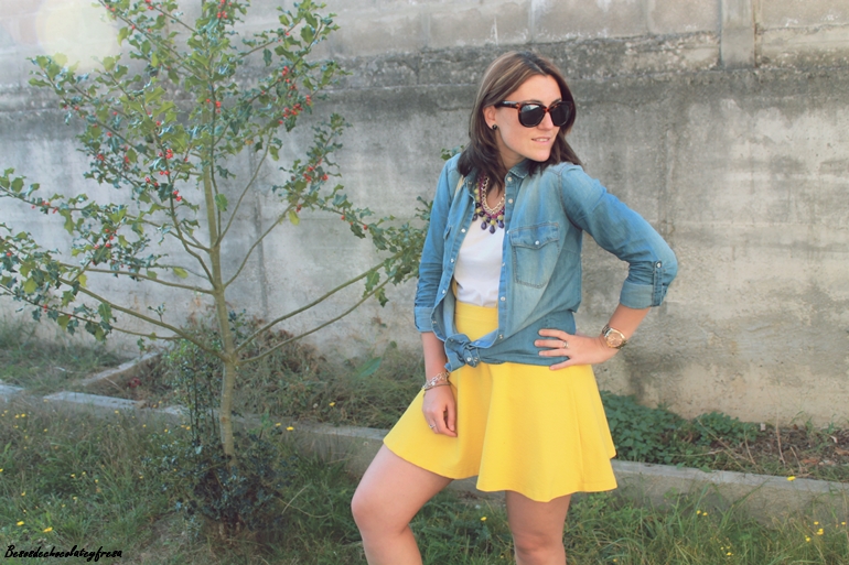 El color amarillo de la falda, hace que sea un look colorido y llamativo