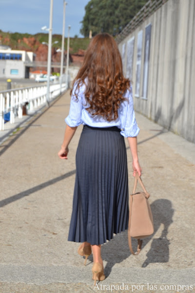 Doblete de tendencia en una sola prenda, la falda midi plisada efecto piel de Stradivarius, una prenda super elegante y versátil que nos da multitud de posibilidades. En este caso la combiné con un básico, la camisa blanca, zapatos imitación pitón, bolso bowling y cinturón dorado, el working look perfecto.