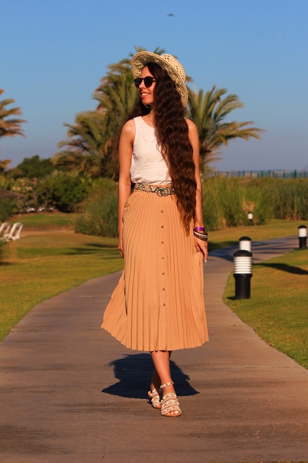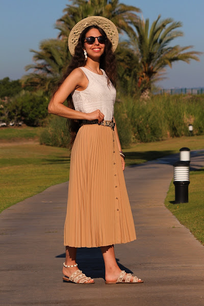 Doblete de tendencia en una sola prenda, la falda midi plisada efecto piel de Stradivarius, una prenda super elegante y versátil que nos da multitud de posibilidades. En este caso la combiné con un básico, la camisa blanca, zapatos imitación pitón, bolso bowling y cinturón dorado, el working look perfecto.