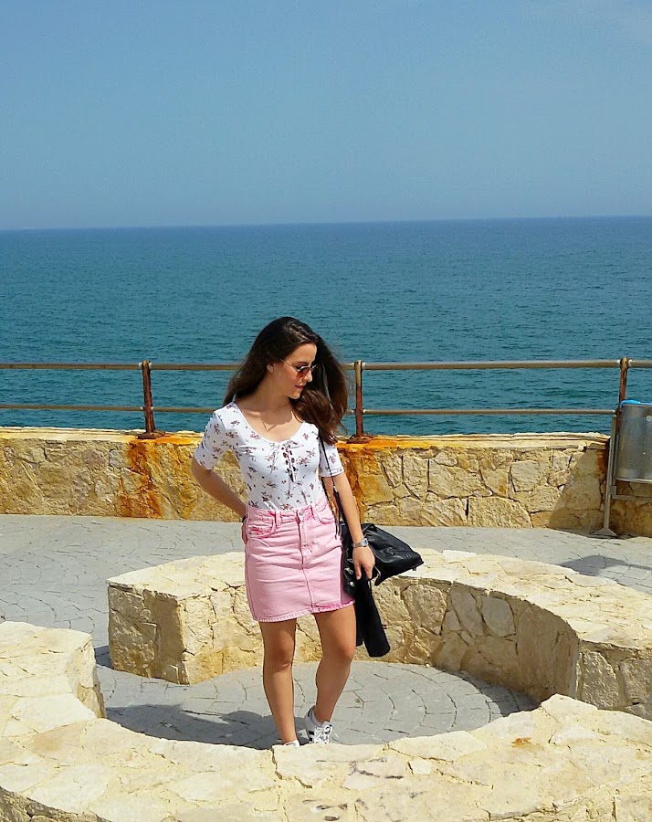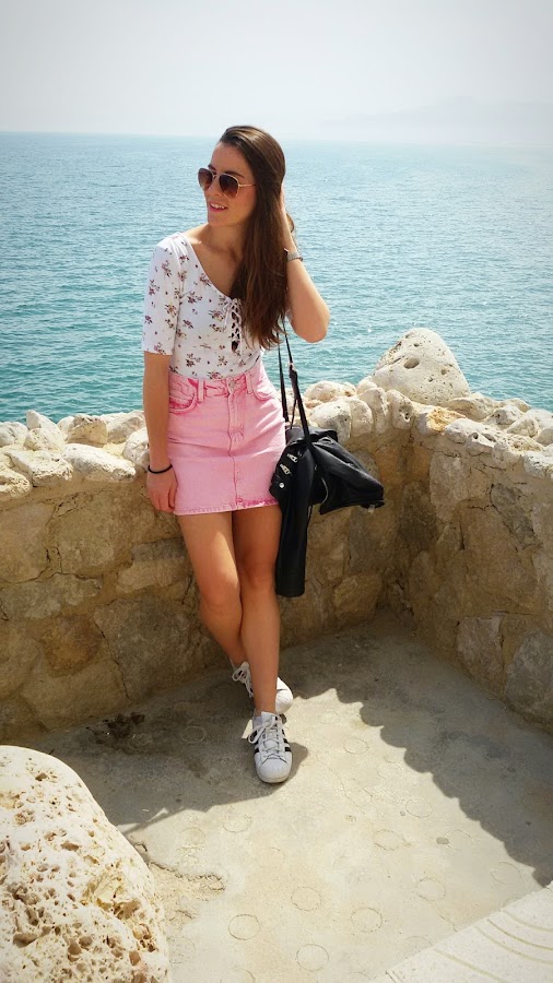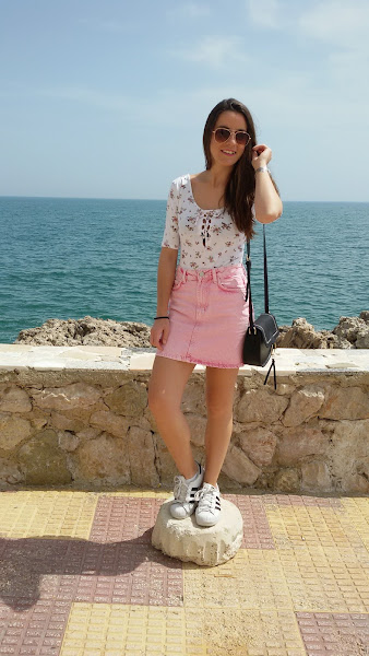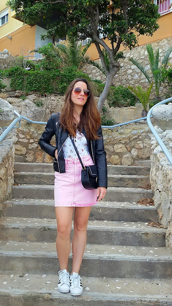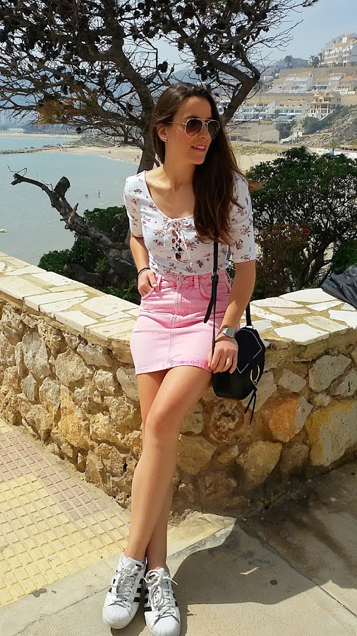 En el post de hoy , os enseño este conjunto primaveral que me parece monísimo y que enseñé en mis redes sociales hace un par de días.Elegí esta falda vaquera en un color rosa chicle que me pareció una prenda básica para estos primeros días en los que vamos sin medias y queremos ir cómodas. Es de tiro alto y se ajusta genial al cuerpo. Combiné la falda con este body que vi hace tiempo en Bershka y me pareció perfecto, por sus flores en tonos granates y rosas y el fondo blanco. Unas deportivas para pasear cómodamente , un bolso bandolero pequeño y una biker para esas tardes en las que refresca.