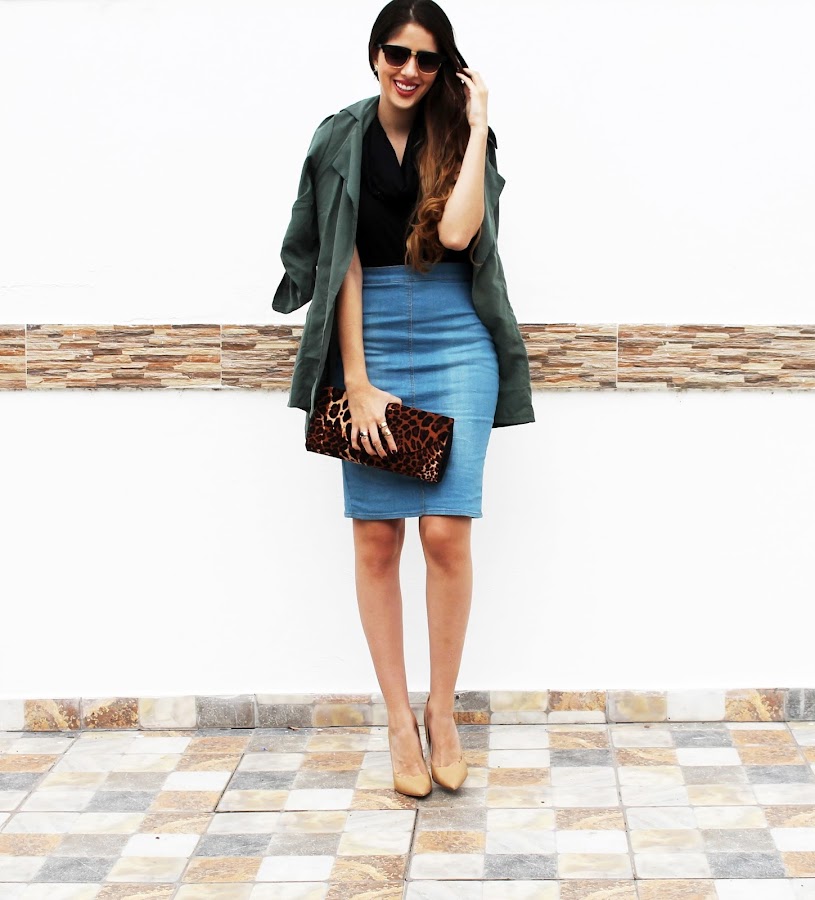 Abrigo: Dressin / Falda de Jean: AmareloTrendy / Camisa: Zara / Tacones: Solo Chicas / Lentes: RayBan / Clutch: McStudio / Anillos: LujoAccesorios