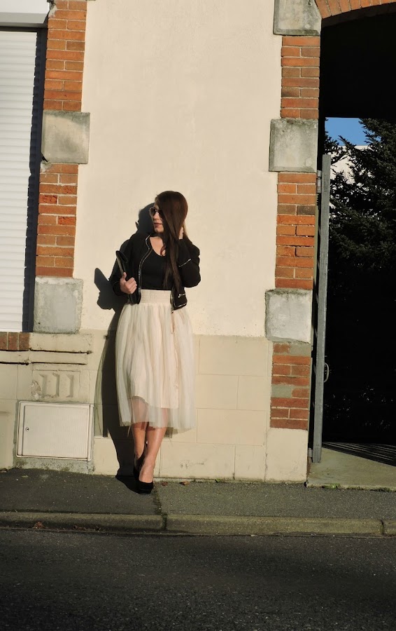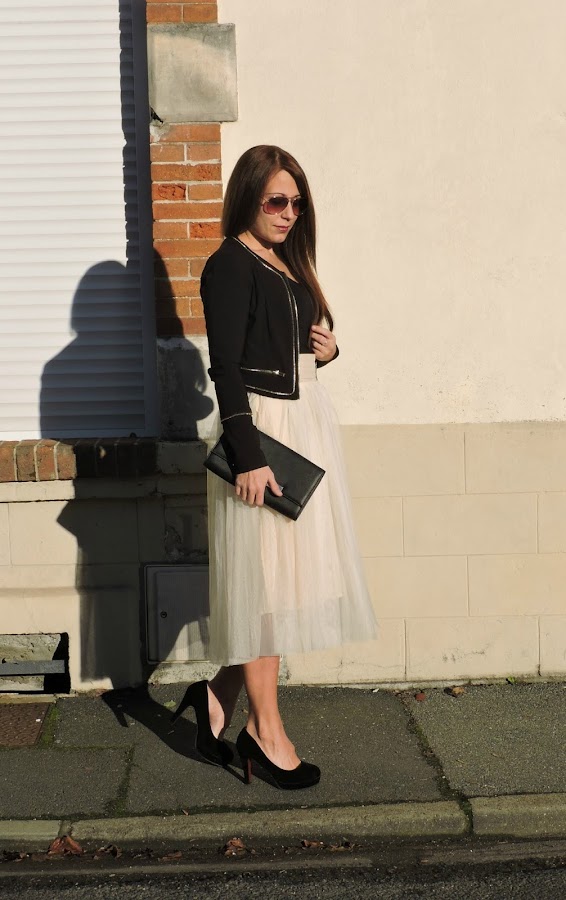 Para dar mi salto a la tendencia tul, opte por esta en blanco roto de sammydress combinada con prendas en negro con pequeños detalles dorados.