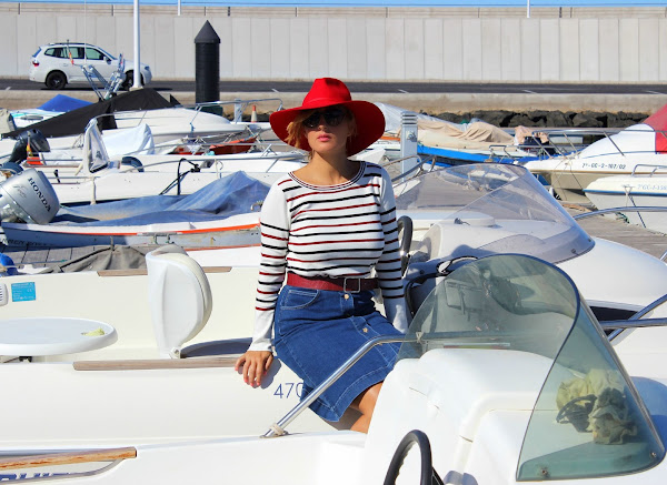 El look de hoy destaca por su sencilla elegancia, con una falda vaquera hasta la rodilla cerrada en la parte delantera con botones y un jersey a rayas inspirado en el estampado navy.