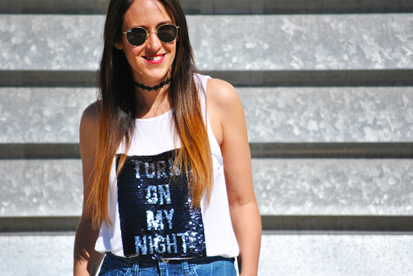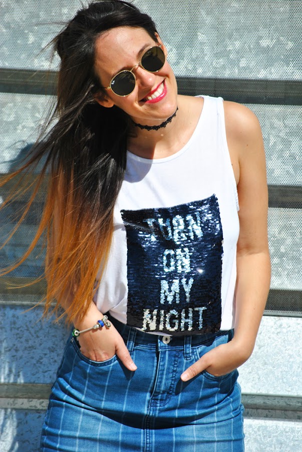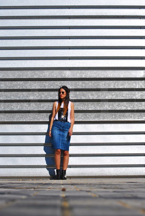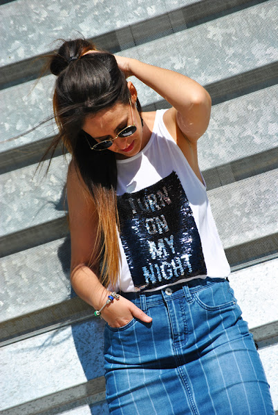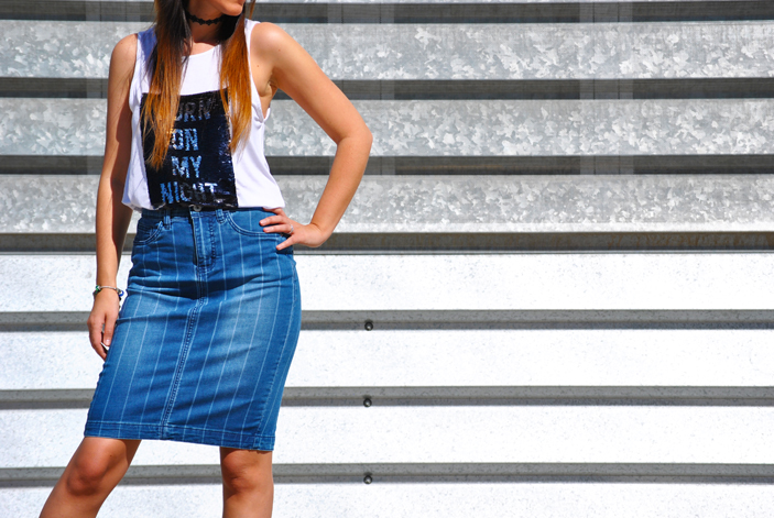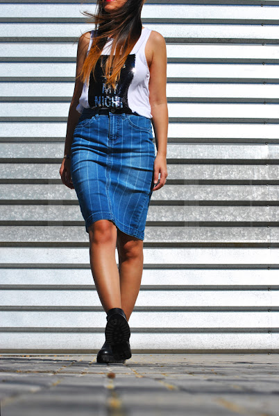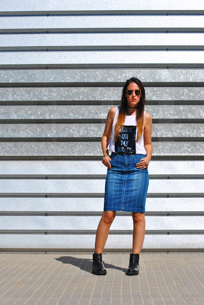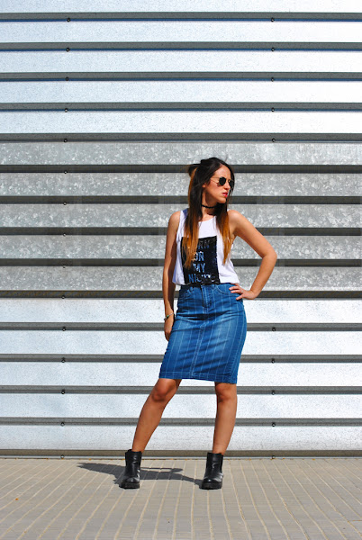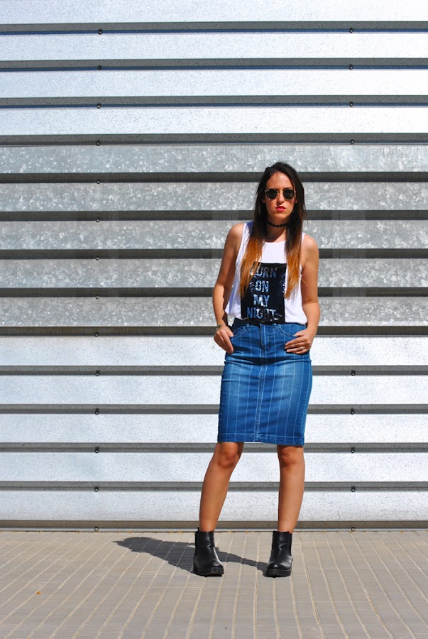 Me encanta porque no es la típica falda vaquera, tiene un largo por la rodilla, ajustada, con rayas verticales y bolsillos traseros. La verdad es que pensé que sería bastante difícil de combinar en un principio pero al ser tan particular, tan solo con unos botines, una camiseta con detalles de lentejuelas y un choker creo que el resultado es ideal. Vosotros que opináis?