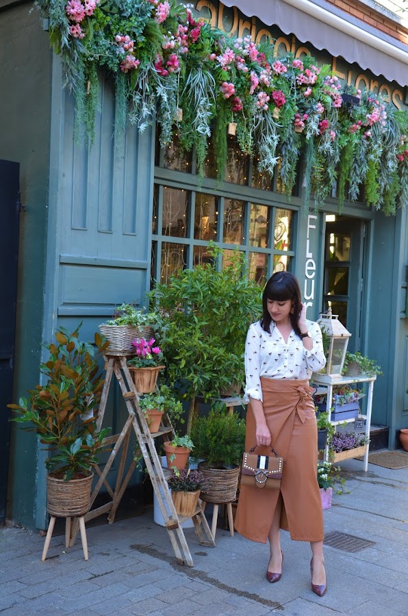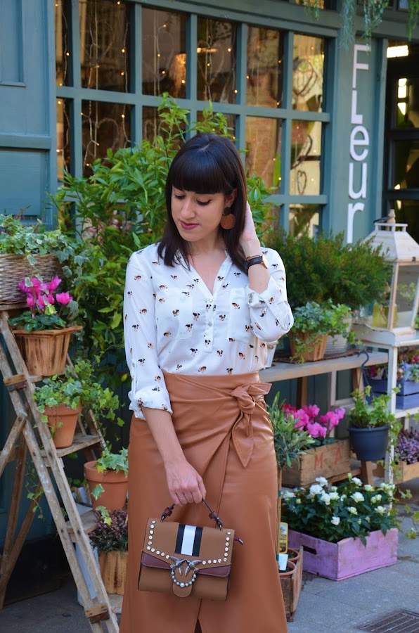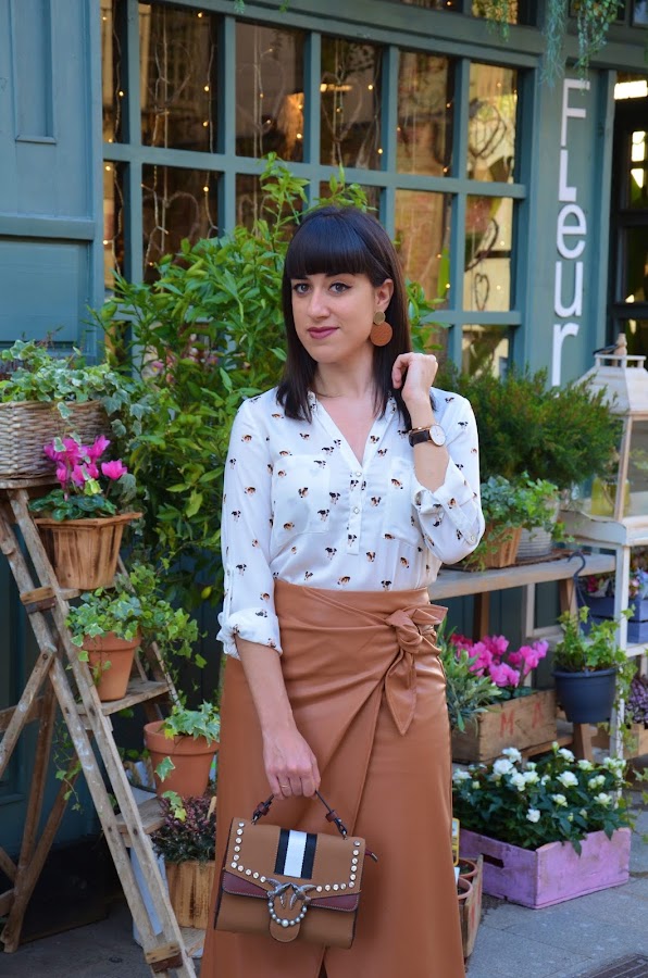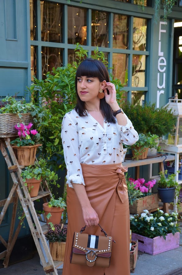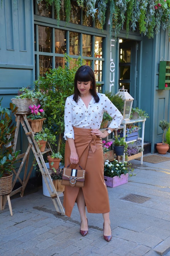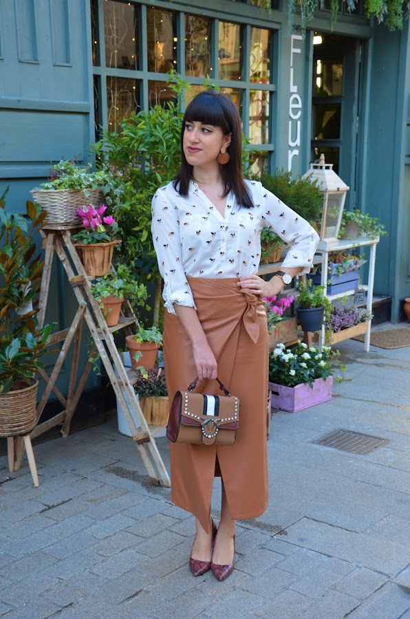 La gran protagonista es la falda wrap de polipiel en color marrón de Shein. Es una auténtica pasada, va anudada en la parte frontal pero tiene cremallera en el lateral por lo que no es necesario hacer y deshacer el nudo cada vez que la pongamos.