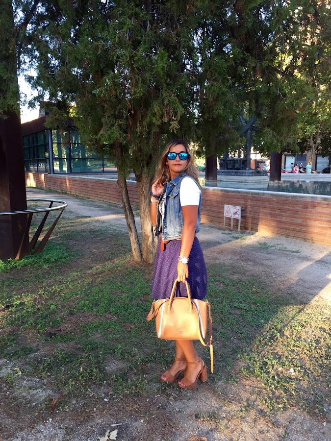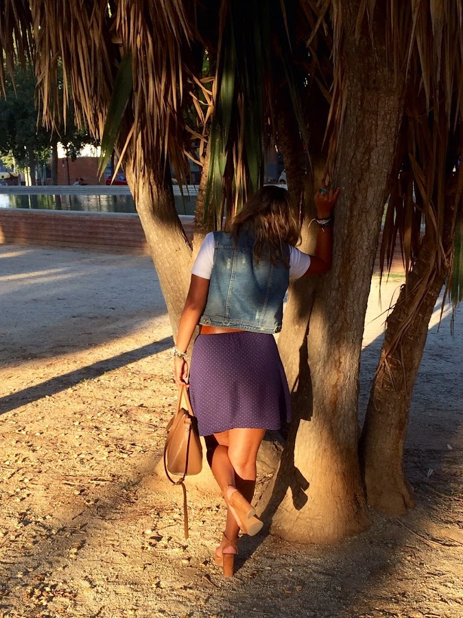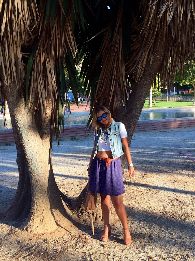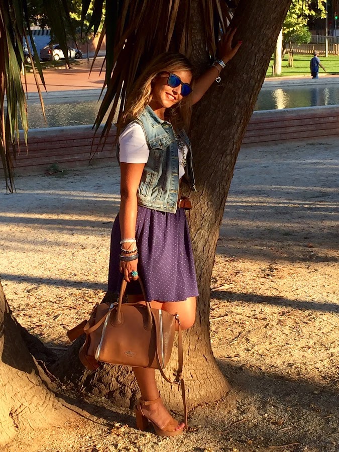 Then, every month I choose a garment and I show you different outfits with this garment to give you ideas how to combine. The garment of this month is the denim vest, because its perfect for this weather. In the outfit of the day, I wear it with a polka dots skirt, a white crop top, my new boho necklace, beige sandals and bag in the same colour.