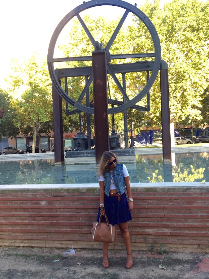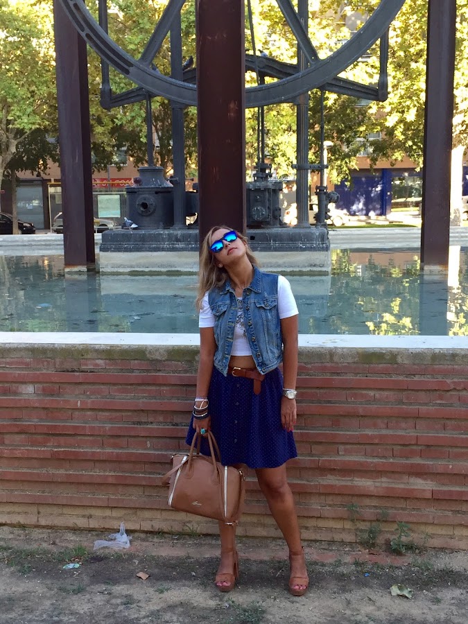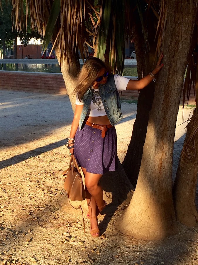 Por ello, cada mes elegiremos una prenda del mes y os enseñare diferentes looks con esa misma prenda, para que podáis sacar mayor partido a vuestra ropa y dar ideas de como podéis combinarla. La prenda que he elegido este mes ha sido el chaleco tejano, que es una prenda muy útil para entretiempo. En el look de hoy, lo he combinado con una falda de topitos que compre en rebajas a muy buen precio, un crop top blanco, mi nuevo collar boho, mis sandalias beige y un bolso en el mismo color.